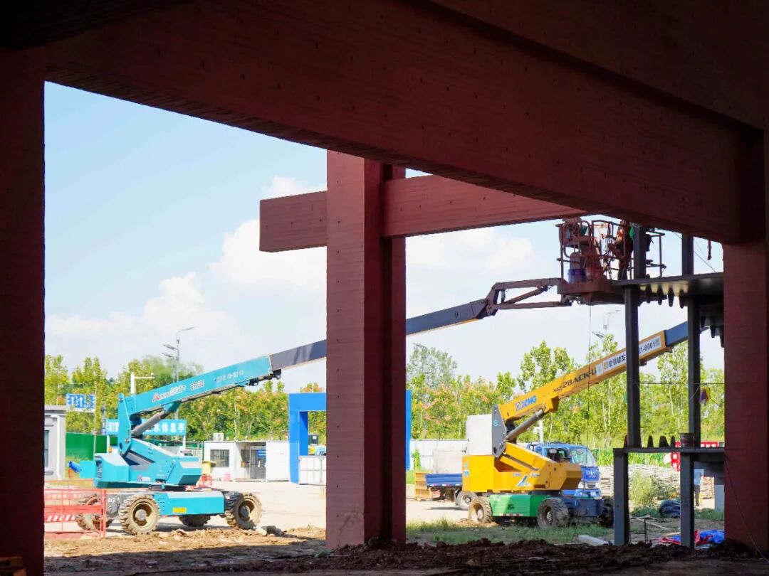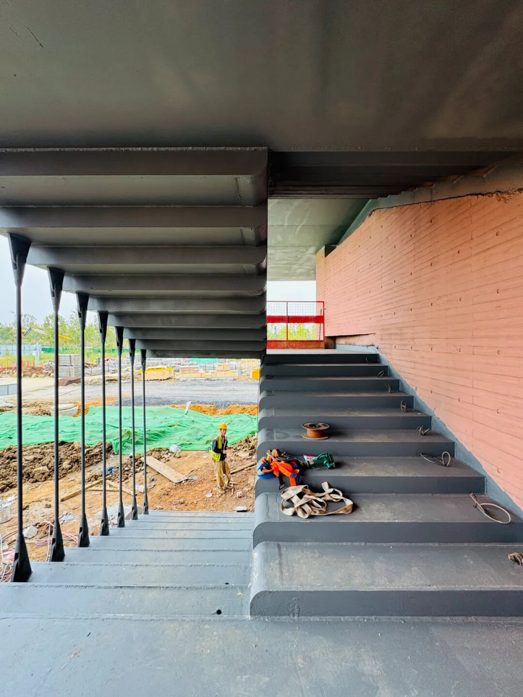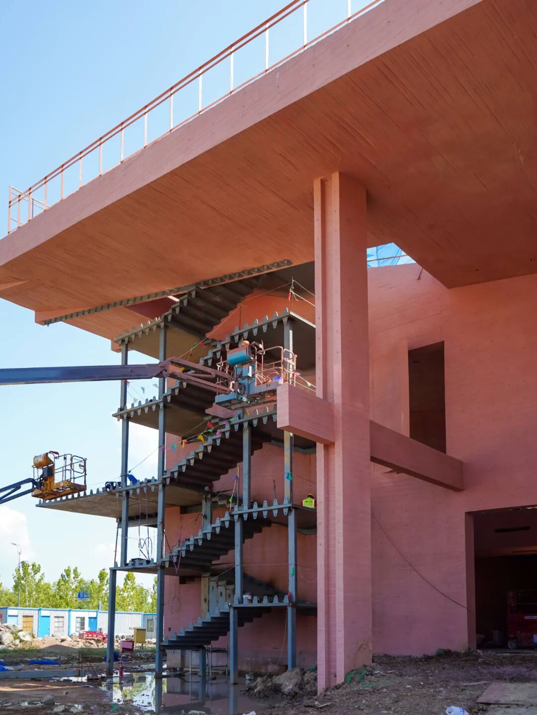 ▲悬挂式楼梯建设过程中搭建临时支撑柱