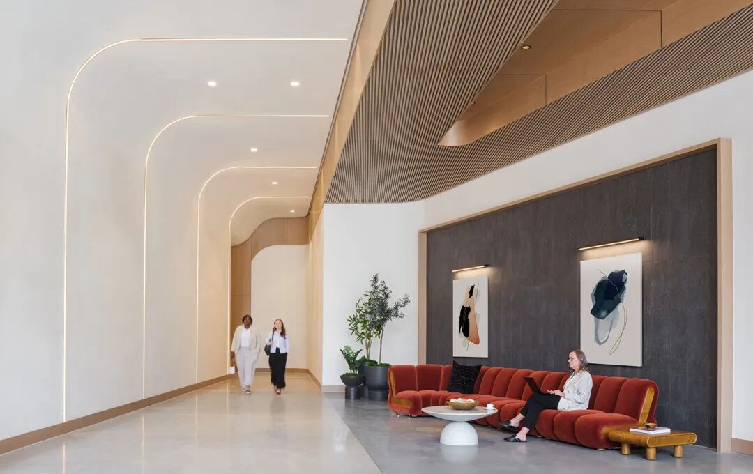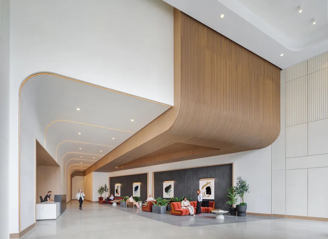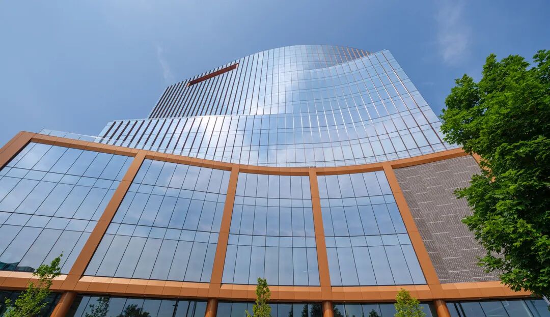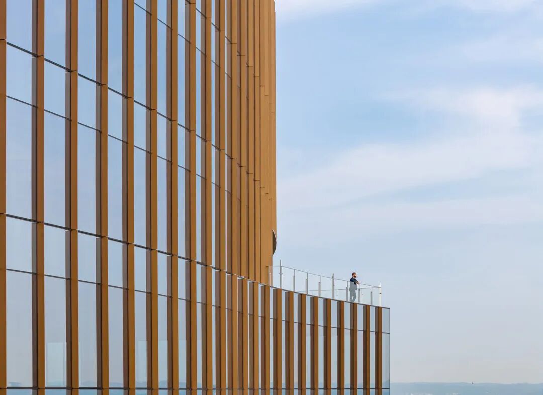 该建筑坐落于一个形状独特的地块上,直接连接东西向主干道,并可从州际公路上清晰可见。其设计特色包括弧线形东立面和层层退台,仿佛从主体结构中剥离出来,营造出宽敞的户外空间,可俯瞰城市全景。建筑外立面采用高性能的通高落地玻璃,而铜色垂直遮阳板则为建筑提供了被动式遮阳系统,并呼应了当地自然土壤的色调。
