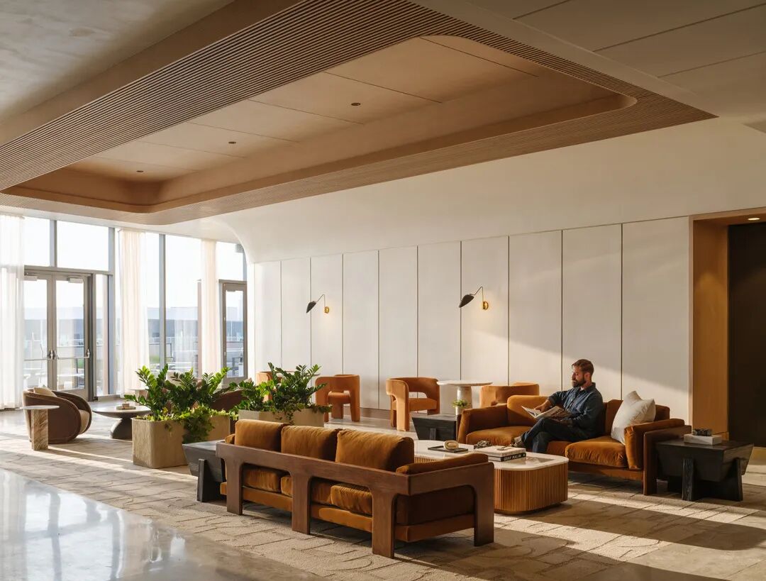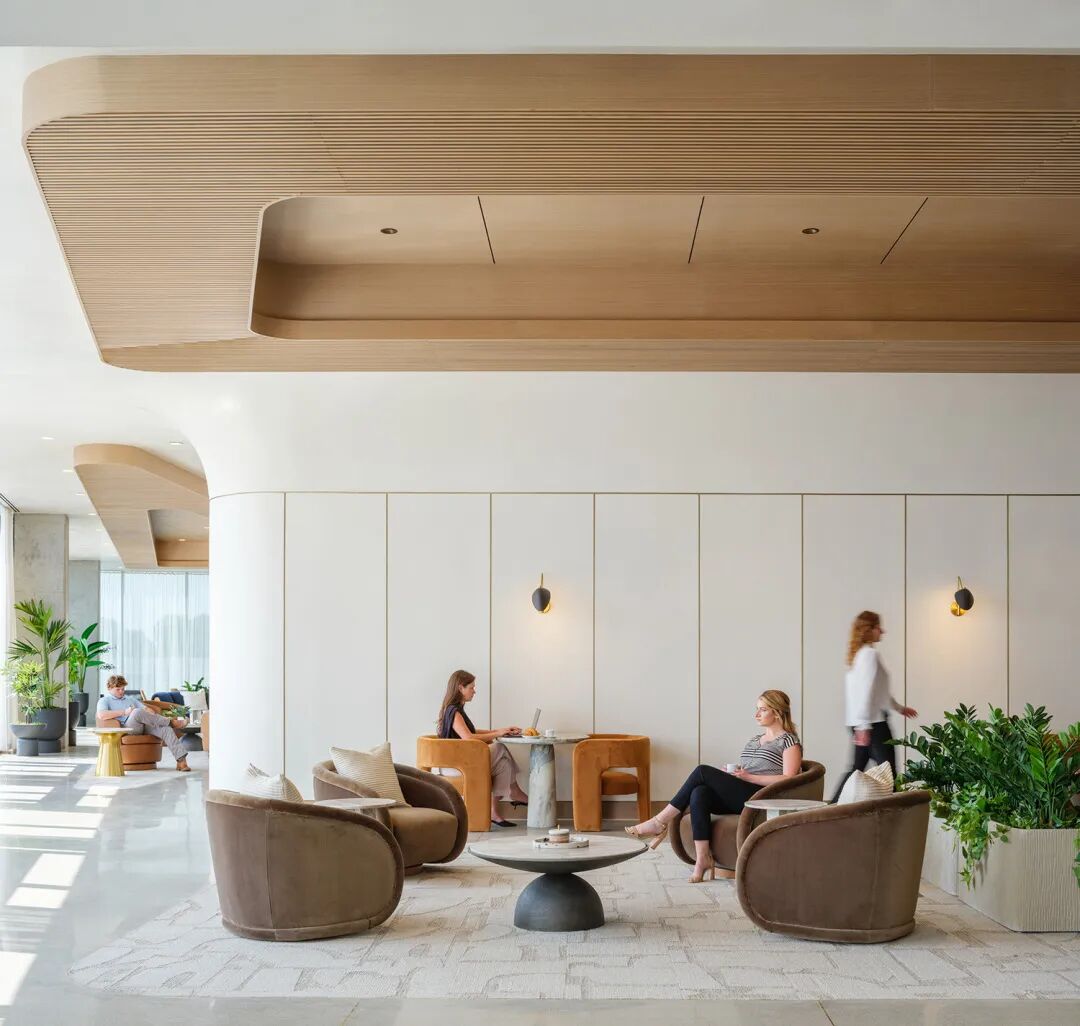 位于塔楼五层的配套设施室内空间由 GP 与 Partners by Design 合作设计,旨在打造健康、灵活与协作的整体环境。设计包括先进的健身中心、即取即走的便利市场、配餐厨房、私人电话间、休息区,以及可分隔且采光充足的培训空间,能够灵活满足不同租户的使用需求。温暖的装饰、层次丰富的材质以及充足的自然采光为空间增添了质感与活力,充分体现了建筑本身及其在纳什维尔当地所代表的前瞻精神。