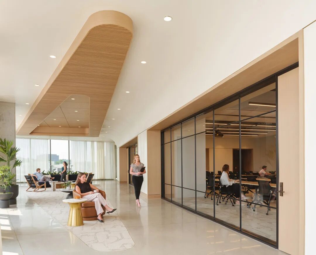 With interiors designed in collaboration with Partners by Design, the expansive amenity offerings on Level 5 craft a cohesive environment that supports wellness, flexibility and collaboration. The design features a state-of-the-art fitness center, grab-and-go market, catering kitchen, private phone rooms, lounges, and divisible, daylit training spaces that can flex for a variety of tenant uses. Warm finishes, layered materials, and abundant daylight bring texture and vibrancy to the space, embodying the forward-looking spirit that defines both the building and its Nashville setting.