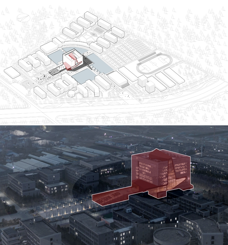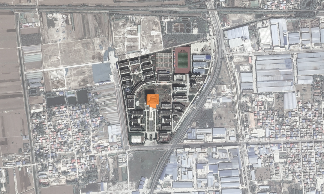 项目位于河南省漯河市郾城区孟庙镇白云山北路与文明路交叉口漯河食品职业学院新校区,处于整个新校区建筑集群的中心位置。