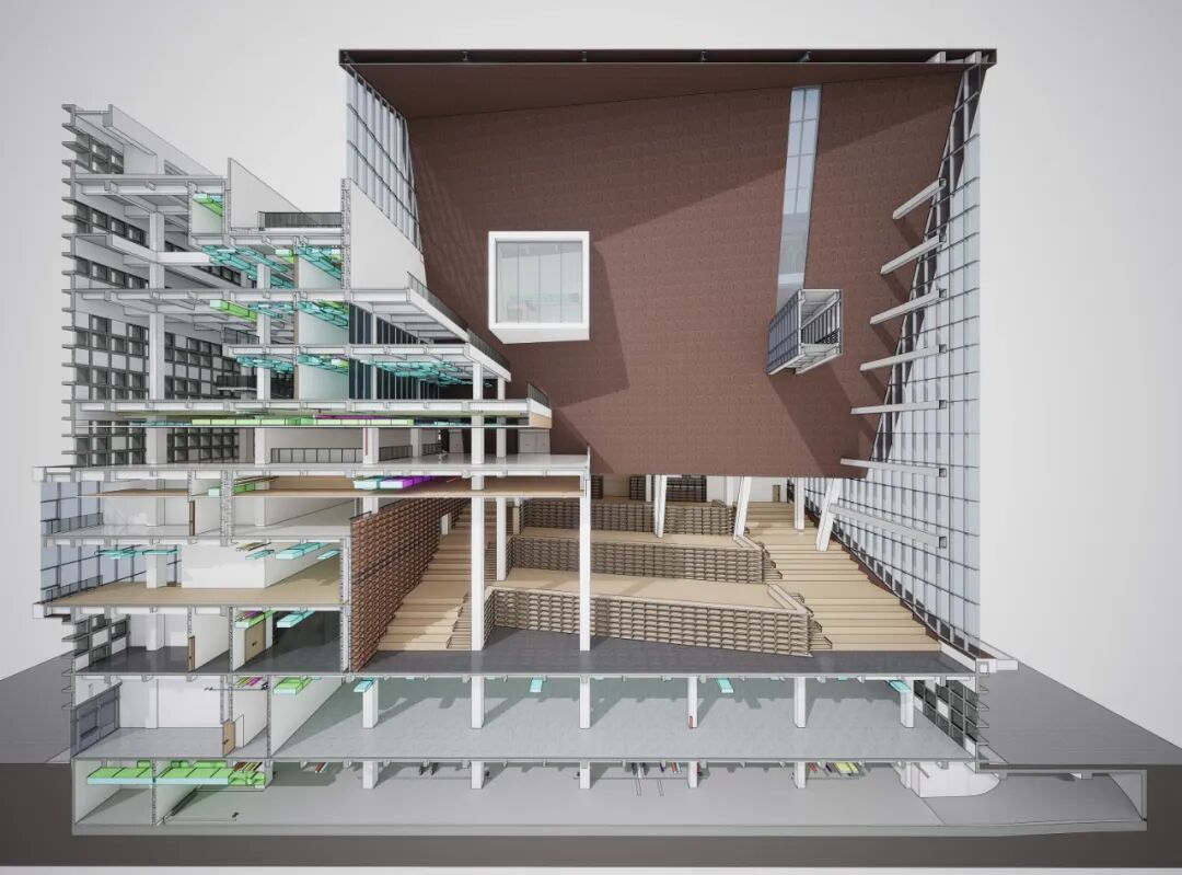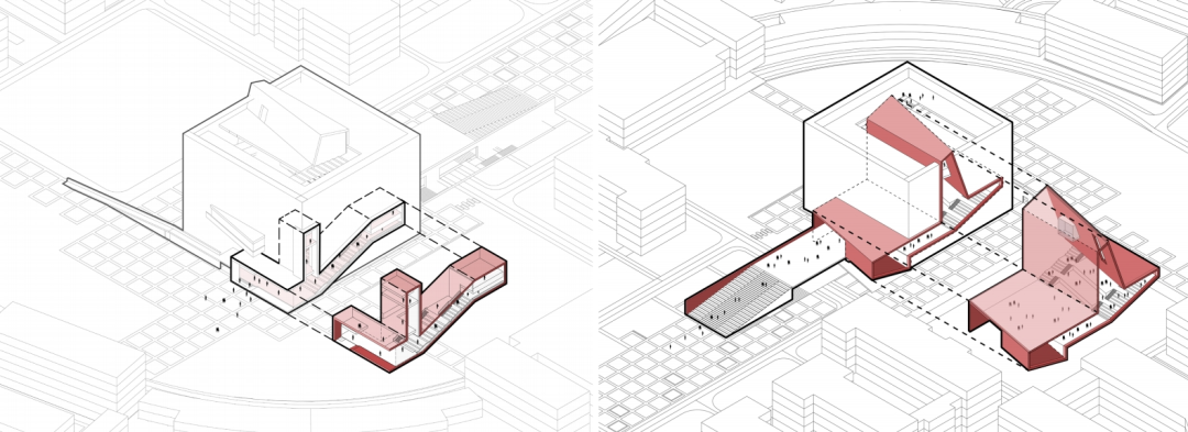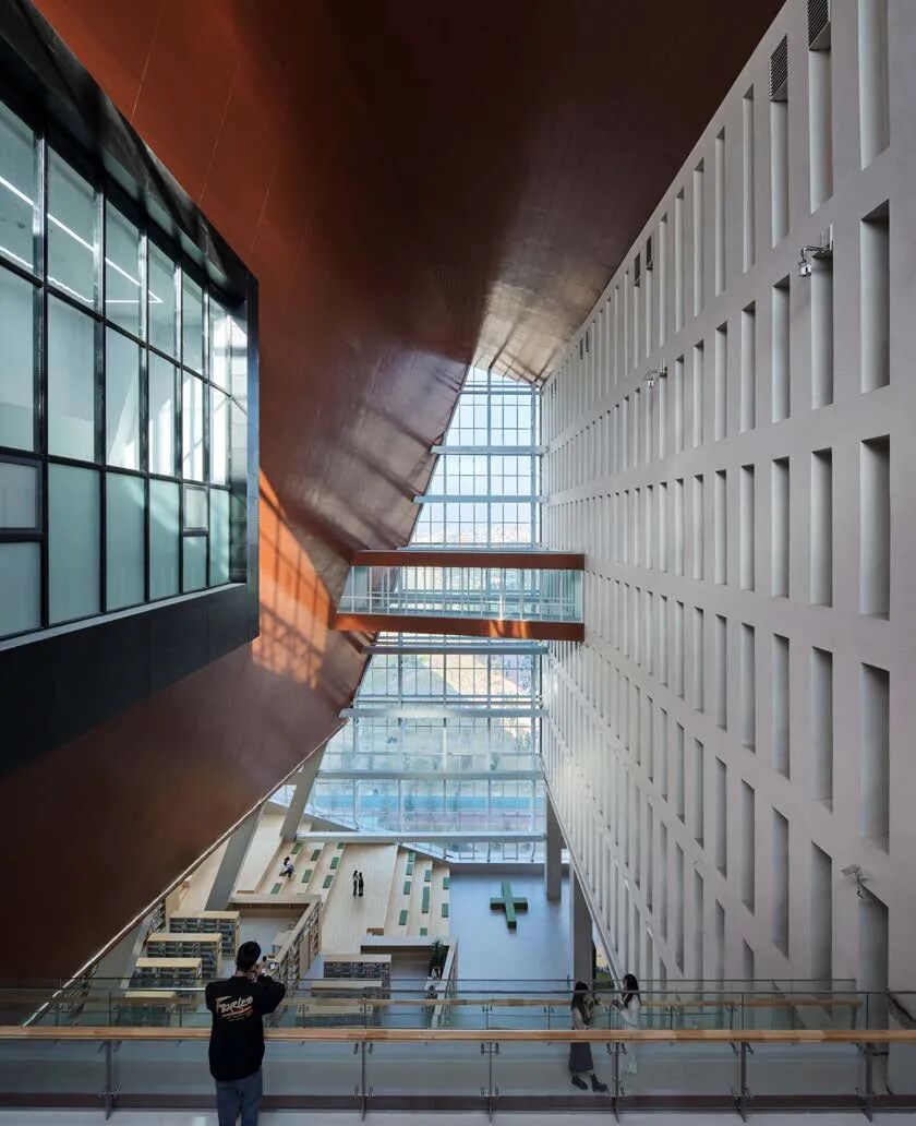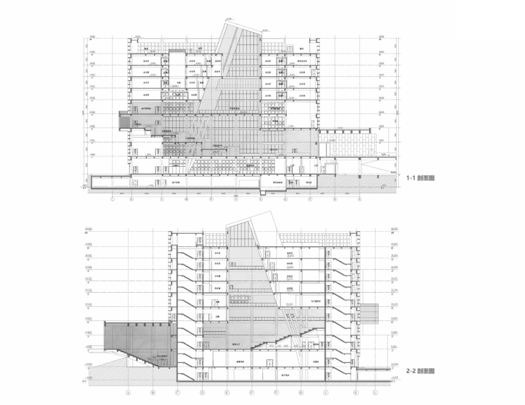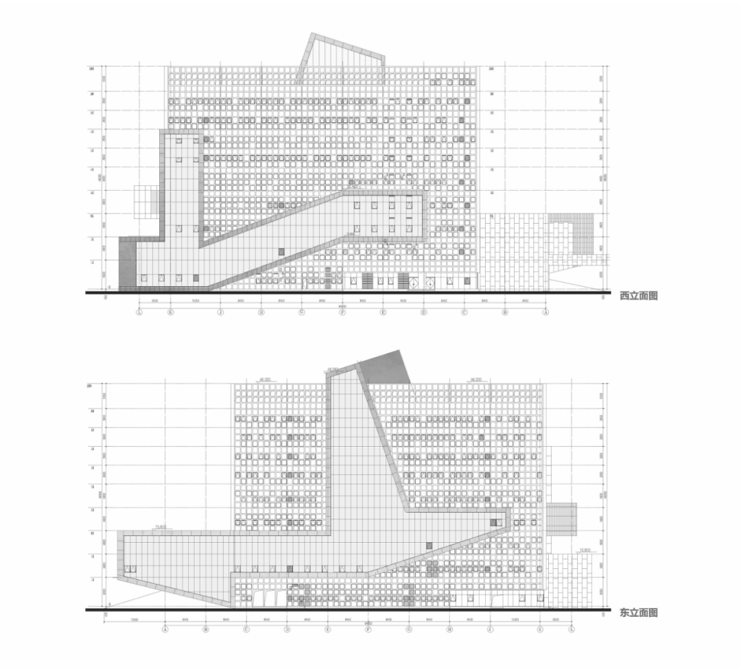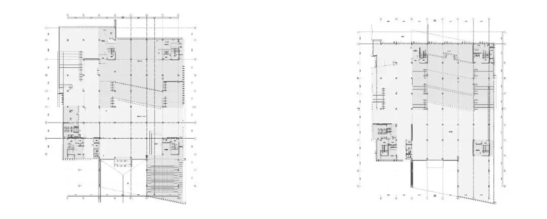 方案采用巨构立方体锚定场地秩序,力图以书山之势为学校创造庄重大气的标志性建筑。用地周围为5-6层的系楼与实验楼、学生宿舍。为避免校园中心广场因尺度过大而显得均质与冷漠,建筑须有足够大的体量创造出具有凝聚力的空间界面完善中心广场的构图。方案尝试以景观元素的形式与外部环境有机融合,在充分利用周边景观的同时美化校园环境,以实现两者景观效果的双提升。本工程校园总体规划轴线明确,图书馆用地位环境基本对称,中轴线上,形成了一个尺度宜人的校园礼仪场所。作为全国知名的食品类职业院校,着重突出其食品特色。将图书馆类比成消化知识的容器,将内部空间组成做成一个连续金属板展开面组合而成的复杂腔体,其他功能围绕着这个腔体,并与之有着视觉和内部功能的联系。腔体在外部与立面相切,形成通透的玻璃幕墙,或者金属实体,或者勾勒的线条。外立面采用混凝土现浇形成立方网格,与金属腔体形成材质的对比,和清晰的图底关系。景观上,延续金属板的材质,构成连续的景观文化墙,展示校园历史;东侧景观分化为四个小园,分别种上不同的植物,体现校园食品文化。由于项目空间复杂,我们设计人员直接使用Archicad软件进行BIM设计,颠覆了以往的翻模模式,在设计过程中实现了三维信息化及对空间关系的推敲,最终形成图纸模型一致的高质量设计成果。 设计过程也采用动态云协同方式,让所有设计人员能够实时共享数据,也让建设方、施工方以有限权限参与数据共享,全过程实现了基于三维的设计协同。内部空间较为复杂,楔形的多边形构成,形成特别的腔体空间,与近大远小的常规心理认知叠合在一起,时而放大,时而缩小,形成特殊的透视效果。内部大空间结合形体采用斜柱支撑;屋顶部分采用钢结构与下部混凝土结构通过金属饰面装饰为一体,中庭东侧大面积玻璃幕墙采用发电玻璃,顶层有电动可开启窗,形成烟囱效应,使得低能耗腔体中庭的设计成为可能。首层、地下一层平面图 FIRST FLOOR & GROUNDFLOOR PLAN二层、三层平面图 SECOND & THIRD FLOOR PLAN建筑:谌珂、郭钦恩、彭帆、周珂、贾长浩、张人泽、牟彦霖、苏笑悦