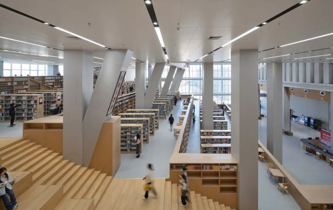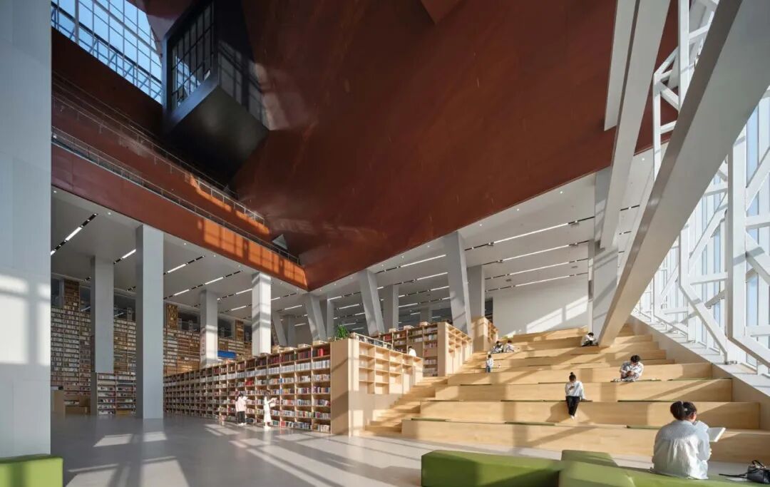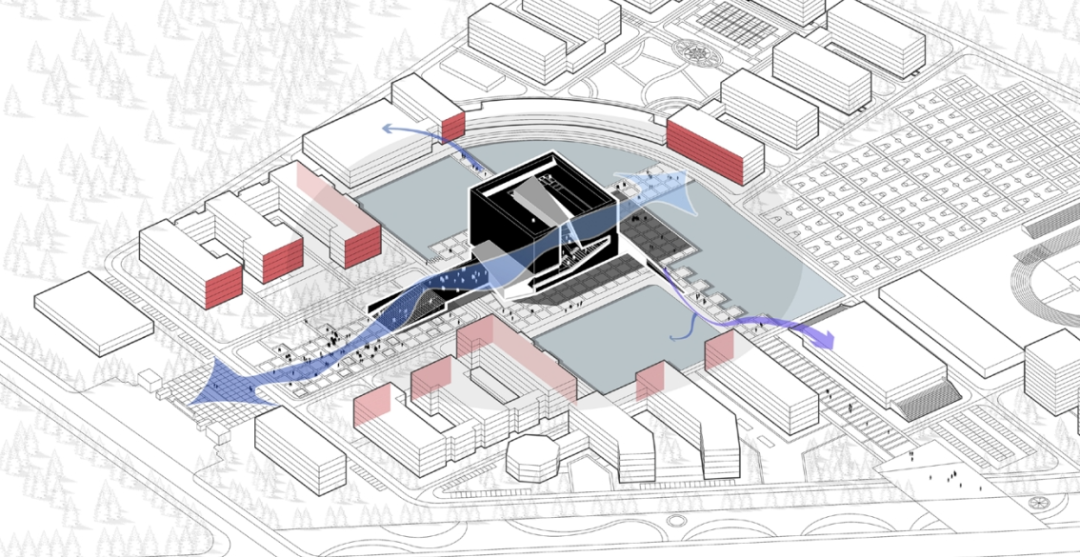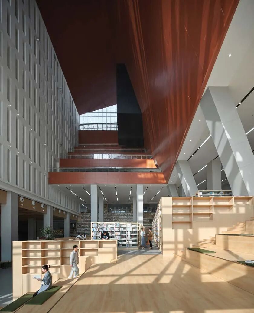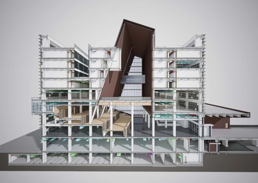 方案采用巨构立方体锚定场地秩序,力图以书山之势为学校创造庄重大气的标志性建筑。用地周围为5-6层的系楼与实验楼、学生宿舍。为避免校园中心广场因尺度过大而显得均质与冷漠,建筑须有足够大的体量创造出具有凝聚力的空间界面完善中心广场的构图。方案尝试以景观元素的形式与外部环境有机融合,在充分利用周边景观的同时美化校园环境,以实现两者景观效果的双提升。本工程校园总体规划轴线明确,图书馆用地位环境基本对称,中轴线上,形成了一个尺度宜人的校园礼仪场所。作为全国知名的食品类职业院校,着重突出其食品特色。将图书馆类比成消化知识的容器,将内部空间组成做成一个连续金属板展开面组合而成的复杂腔体,其他功能围绕着这个腔体,并与之有着视觉和内部功能的联系。腔体在外部与立面相切,形成通透的玻璃幕墙,或者金属实体,或者勾勒的线条。外立面采用混凝土现浇形成立方网格,与金属腔体形成材质的对比,和清晰的图底关系。景观上,延续金属板的材质,构成连续的景观文化墙,展示校园历史;东侧景观分化为四个小园,分别种上不同的植物,体现校园食品文化。由于项目空间复杂,我们设计人员直接使用Archicad软件进行BIM设计,颠覆了以往的翻模模式,在设计过程中实现了三维信息化及对空间关系的推敲,最终形成图纸模型一致的高质量设计成果。 设计过程也采用动态云协同方式,让所有设计人员能够实时共享数据,也让建设方、施工方以有限权限参与数据共享,全过程实现了基于三维的设计协同。内部空间较为复杂,楔形的多边形构成,形成特别的腔体空间,与近大远小的常规心理认知叠合在一起,时而放大,时而缩小,形成特殊的透视效果。内部大空间结合形体采用斜柱支撑;屋顶部分采用钢结构与下部混凝土结构通过金属饰面装饰为一体,中庭东侧大面积玻璃幕墙采用发电玻璃,顶层有电动可开启窗,形成烟囱效应,使得低能耗腔体中庭的设计成为可能。首层、地下一层平面图 FIRST FLOOR & GROUNDFLOOR PLAN二层、三层平面图 SECOND & THIRD FLOOR PLAN建筑:谌珂、郭钦恩、彭帆、周珂、贾长浩、张人泽、牟彦霖、苏笑悦