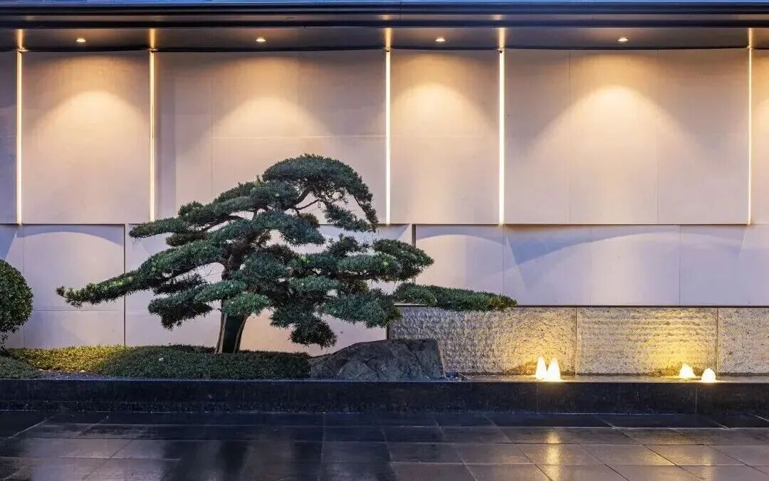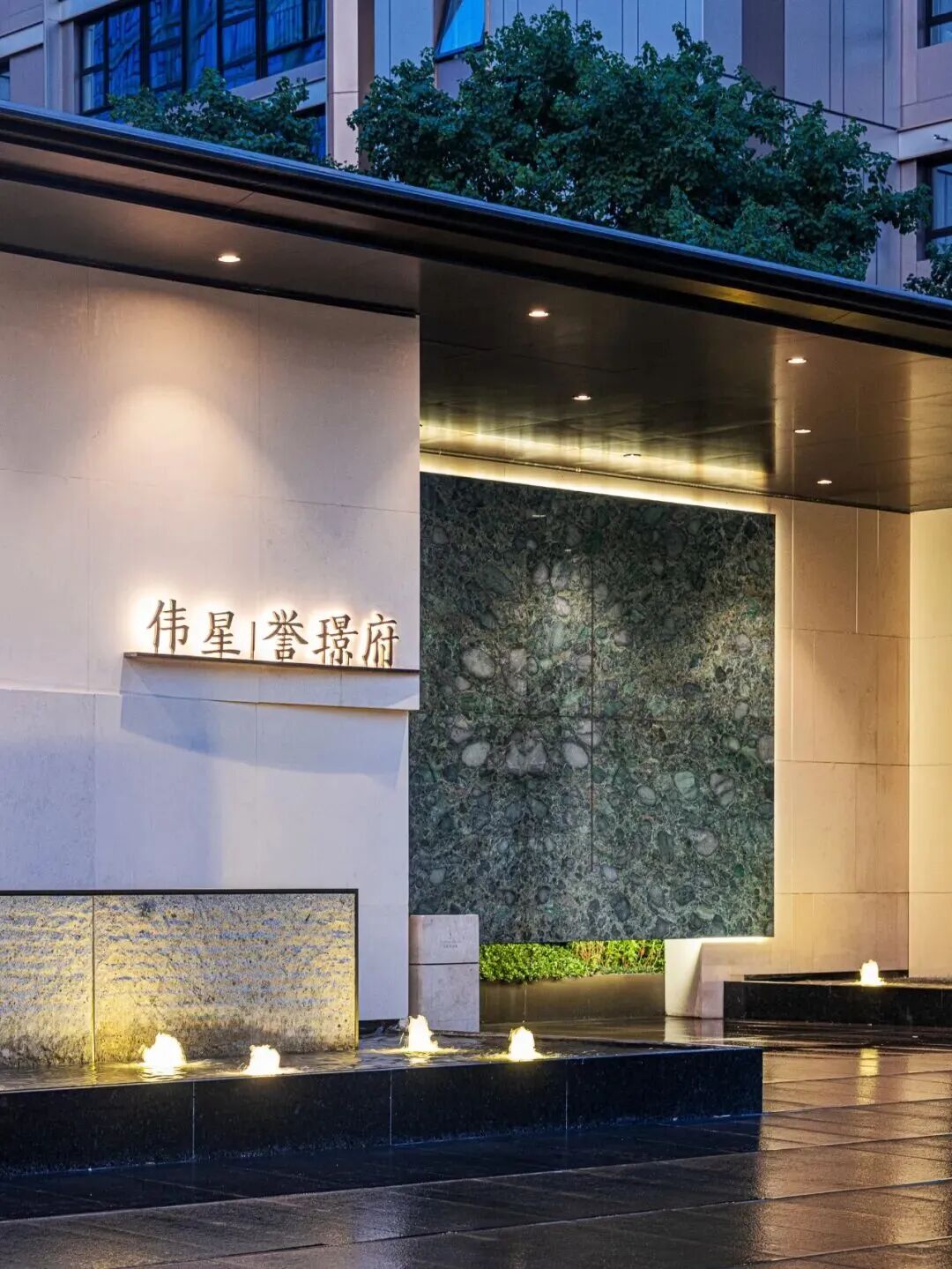 酒店式入口处,弧形葡萄牙米黄大块石材与祖母绿碰撞出艺术张力,厚重中透着轻盈。独特弧形工艺,勾勒轻奢时尚格调。立面升级以“强化仪式感”为核心,新增东湖石景墙与造型松相得益彰,于原设计上迭代品质。
