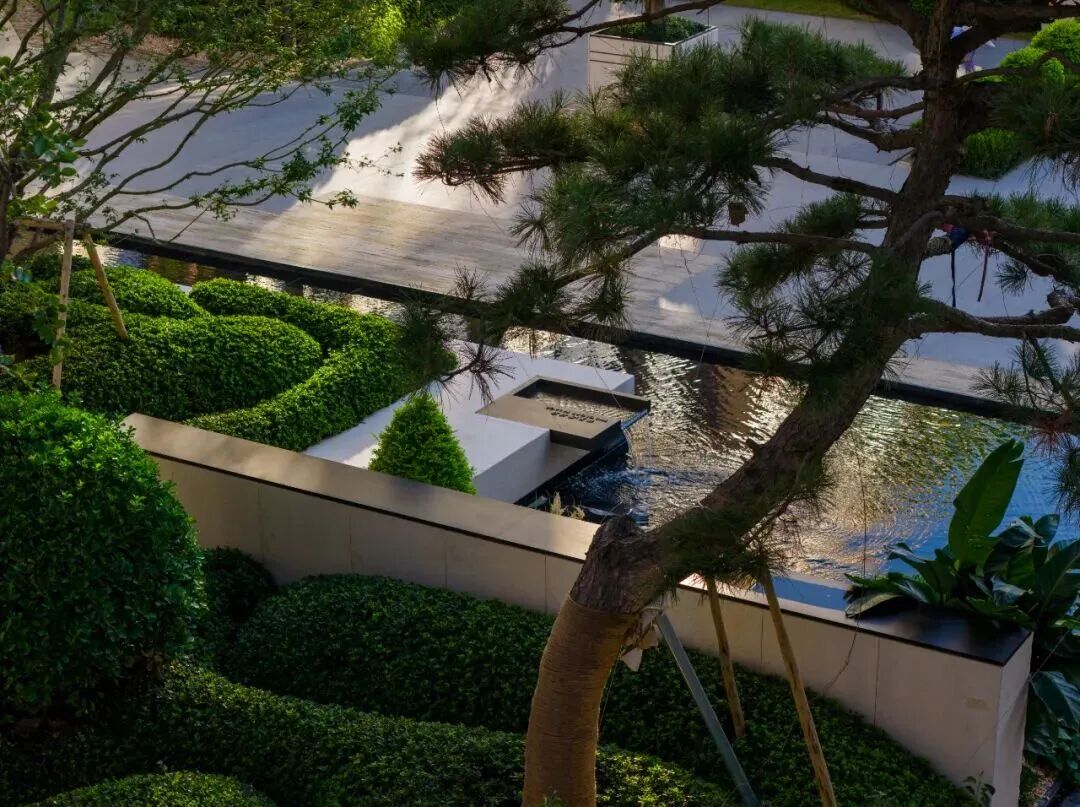 有序的空间结构,内外相融渗透,自成一方熠熠生辉的景致。精致的植景层层围合,营造全天候多功能会客厅。廊架、植物、水景、艺术小品错落于步履间,既增强了参与意趣,更令人恍若隐匿林间,从容铺展生活的闲情与诗意。