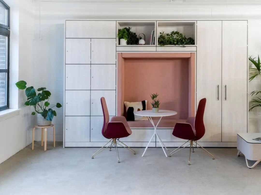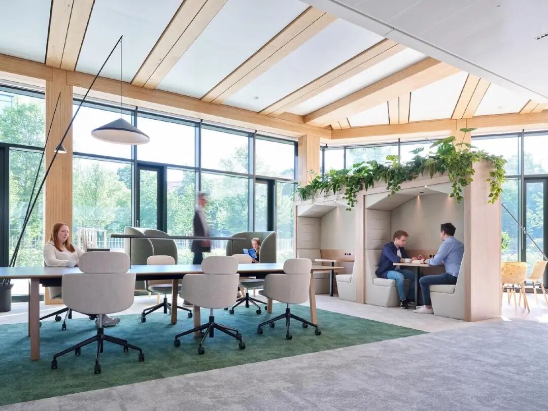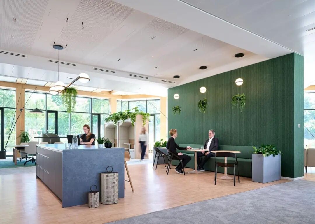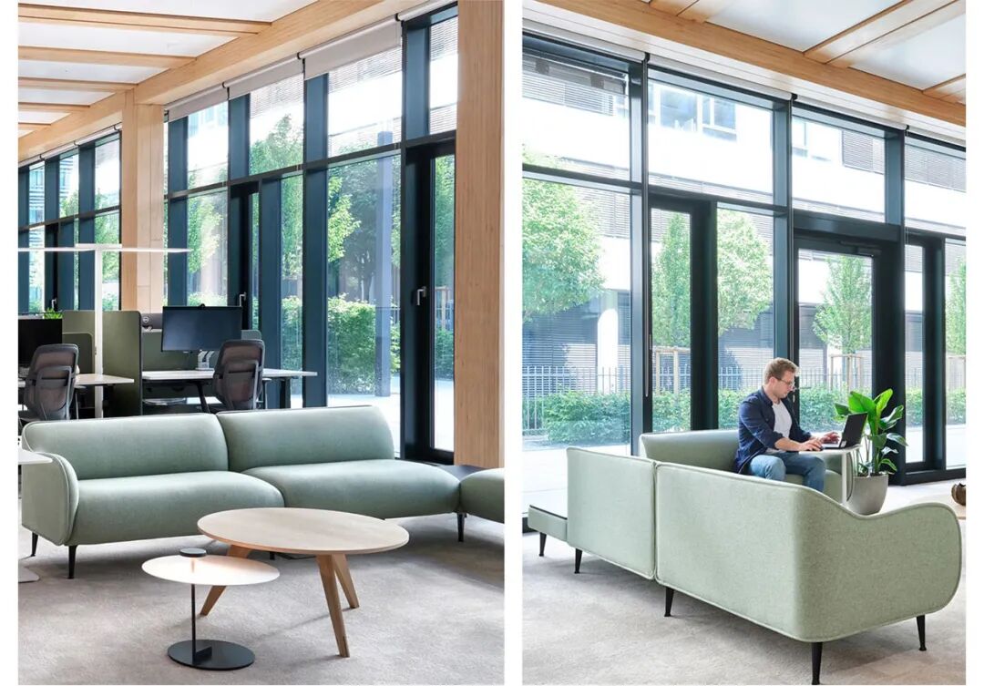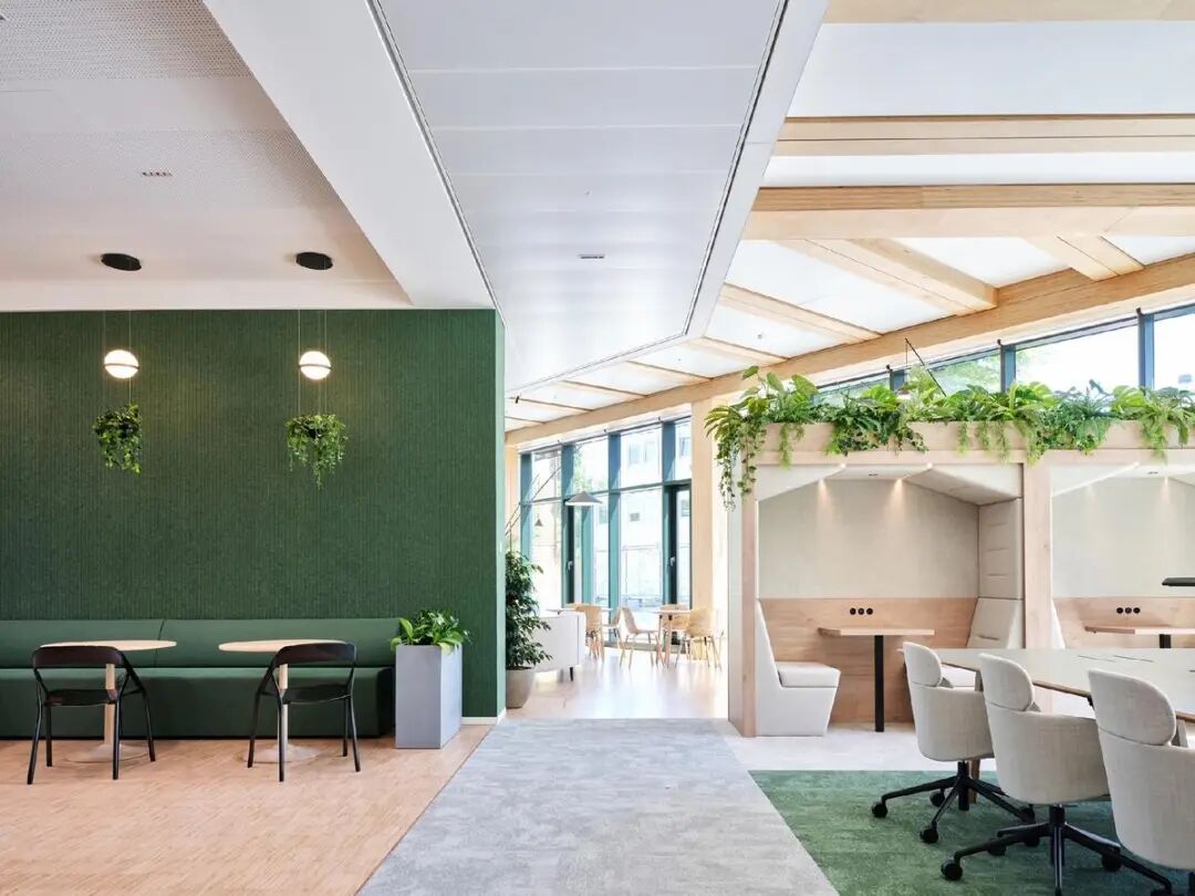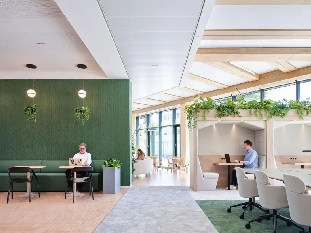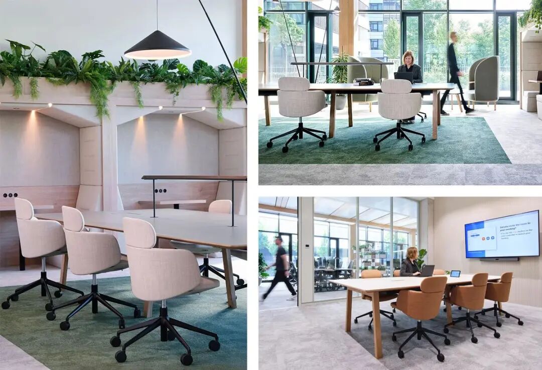 街区的蓬勃生机与室内精致酒店式设计理念相得益彰,为员工与访客打造出兼具当代质感与舒适体验的空间。Gensler通过模块化设计重构了工作模式灵活切换的场景:采用可完全互换的工作站系统,在促进协作的沙发环绕布局与专注工作的办公桌模式之间自由转换。标志性的三角协作区既可开展实践研讨会,也可转为休闲餐饮区。挑高中庭以开阔视野迎候访客,遍布空间的绿植既作为区域隔断,又有效提升声学舒适度,将亲生命设计理念深植每个细节。