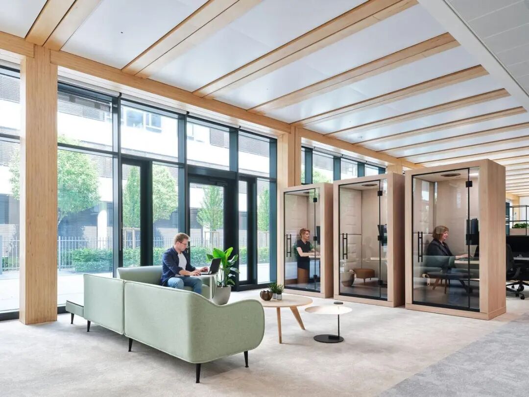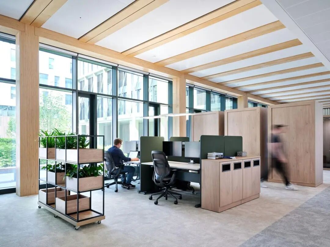 为呼应这座木结构、LEED铂金级认证建筑的高性能理念,Gensler的室内装修同样以LEED铂金级为标准,大量采用天然材质。高阔层高与通透玻璃幕墙营造出明亮开阔的空间氛围,而通过降低墙板高度、悬挂绿植花盆等尺度的精细化处理,为开放楼层注入了一份舒适的亲和感。