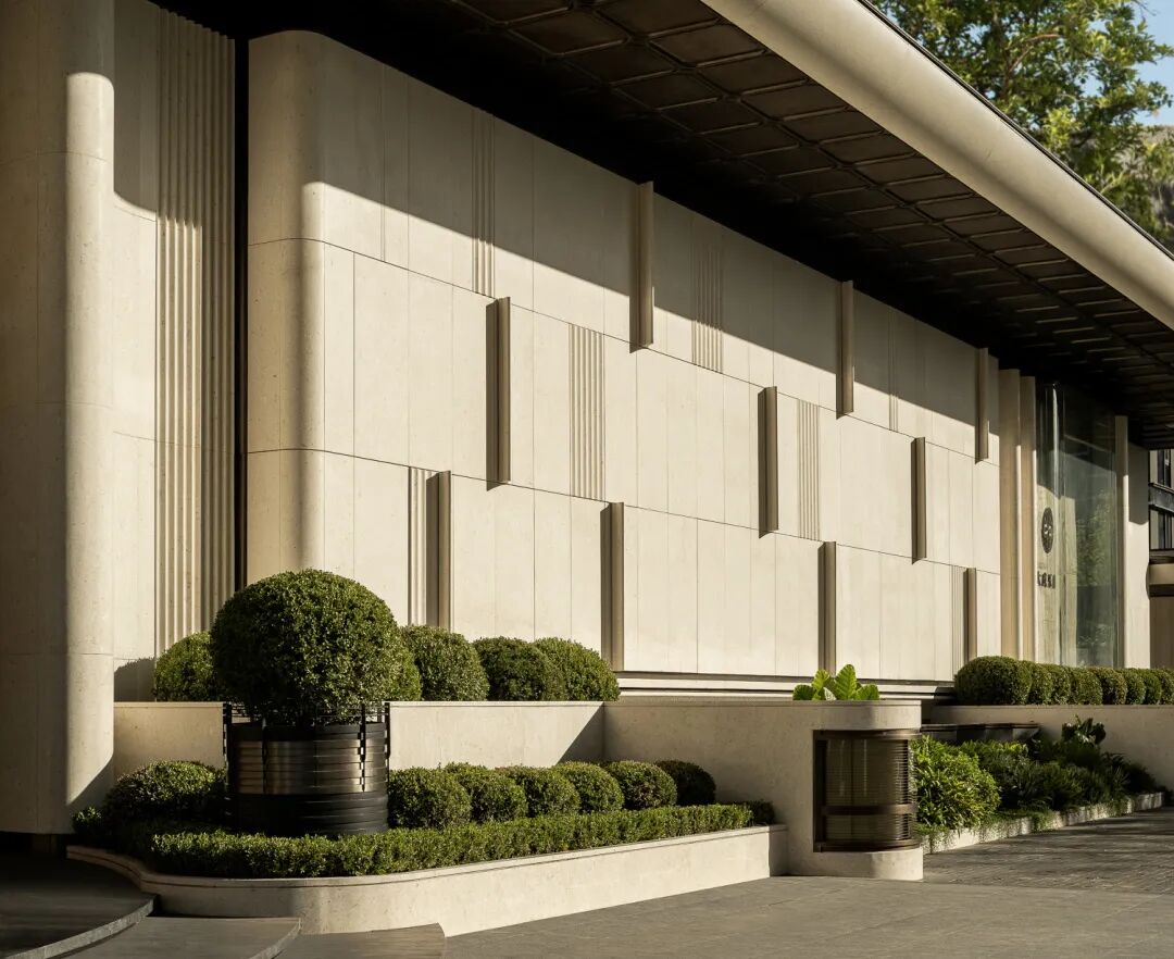 地下车库出入口采用 “悬浮式雨棚 + 线性立面” 的组合,雨棚以流畅的曲线形态横向延展,形成强烈的视觉聚焦点;凹面石材造型,通过竖向线条的重复排列,在立面上形成富有韵律的凹凸层次,增强了空间的纵深感与序列感。