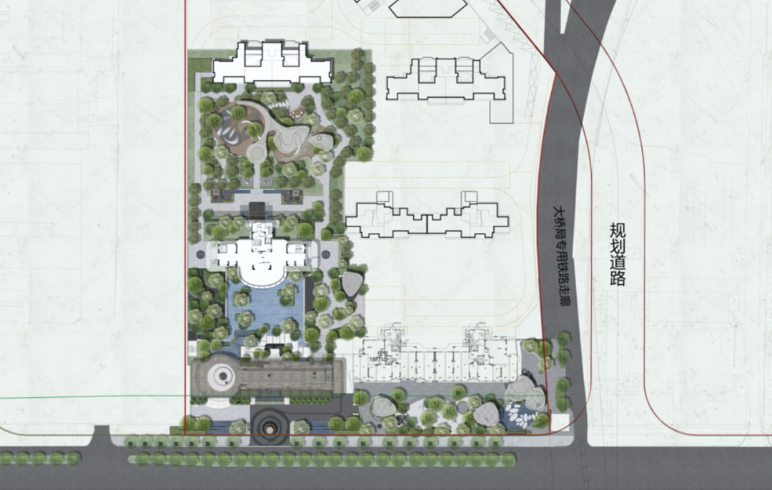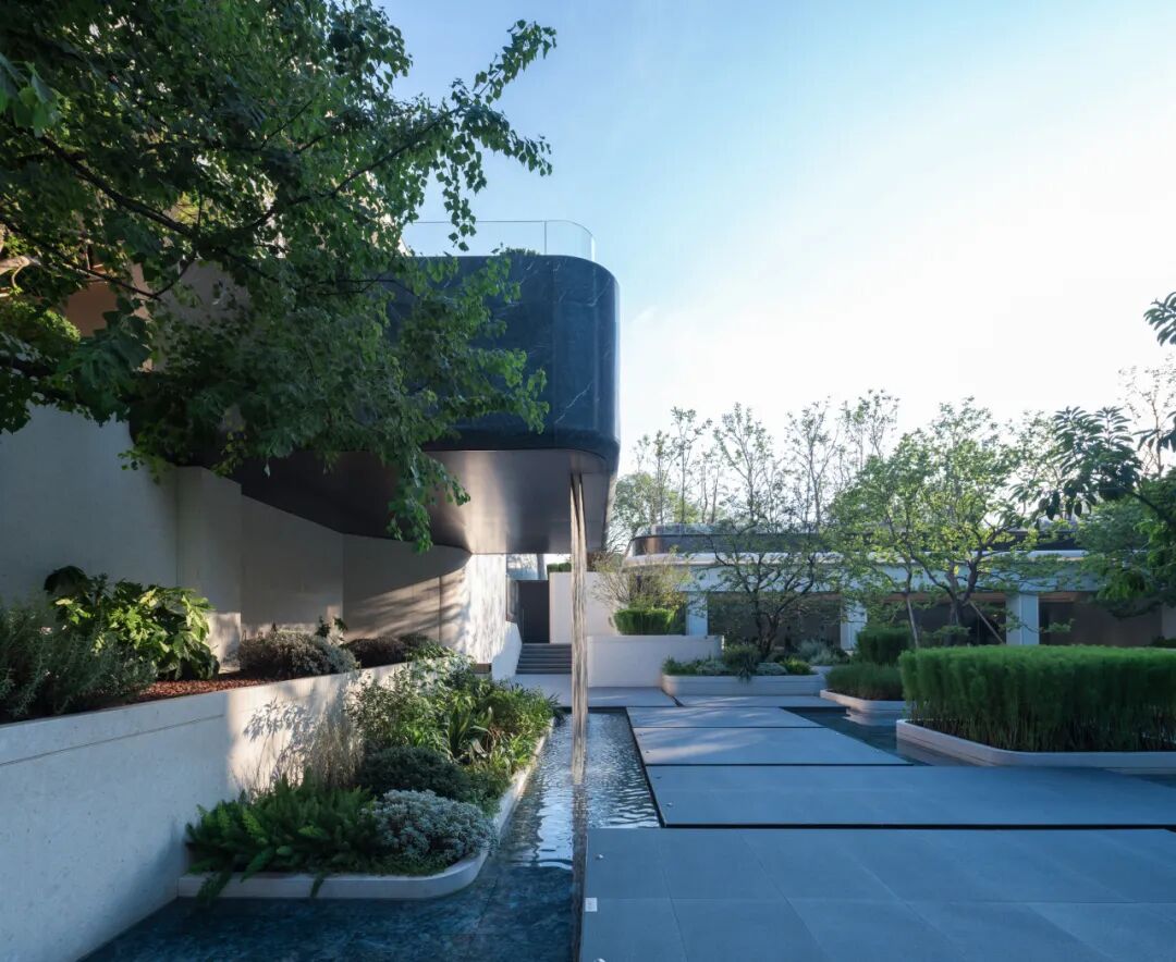中央景观轴、下沉式花园等景观空间的规划,是对生态理念的践行,通过 “旱溪 - 镜面水景 - 下沉花园” 的层次设计,构建起生态与生活交融的景观系统,使建筑布局与自然环境形成良性互动。