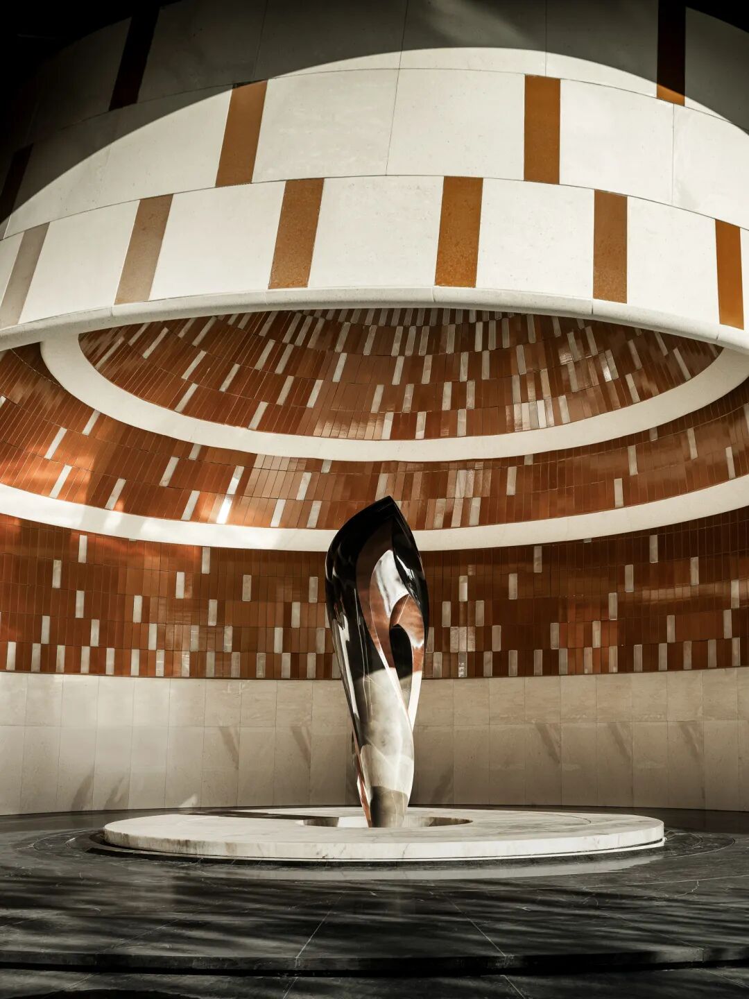 造型创意深植于曾侯乙编钟三层错落有致、悬挂于曲尺形钟架之上的经典图景。精选11166片高定陶砖与温润透光的云石,经由纯手工的细腻拼接,构筑出三层叠级的编钟造型曲面。