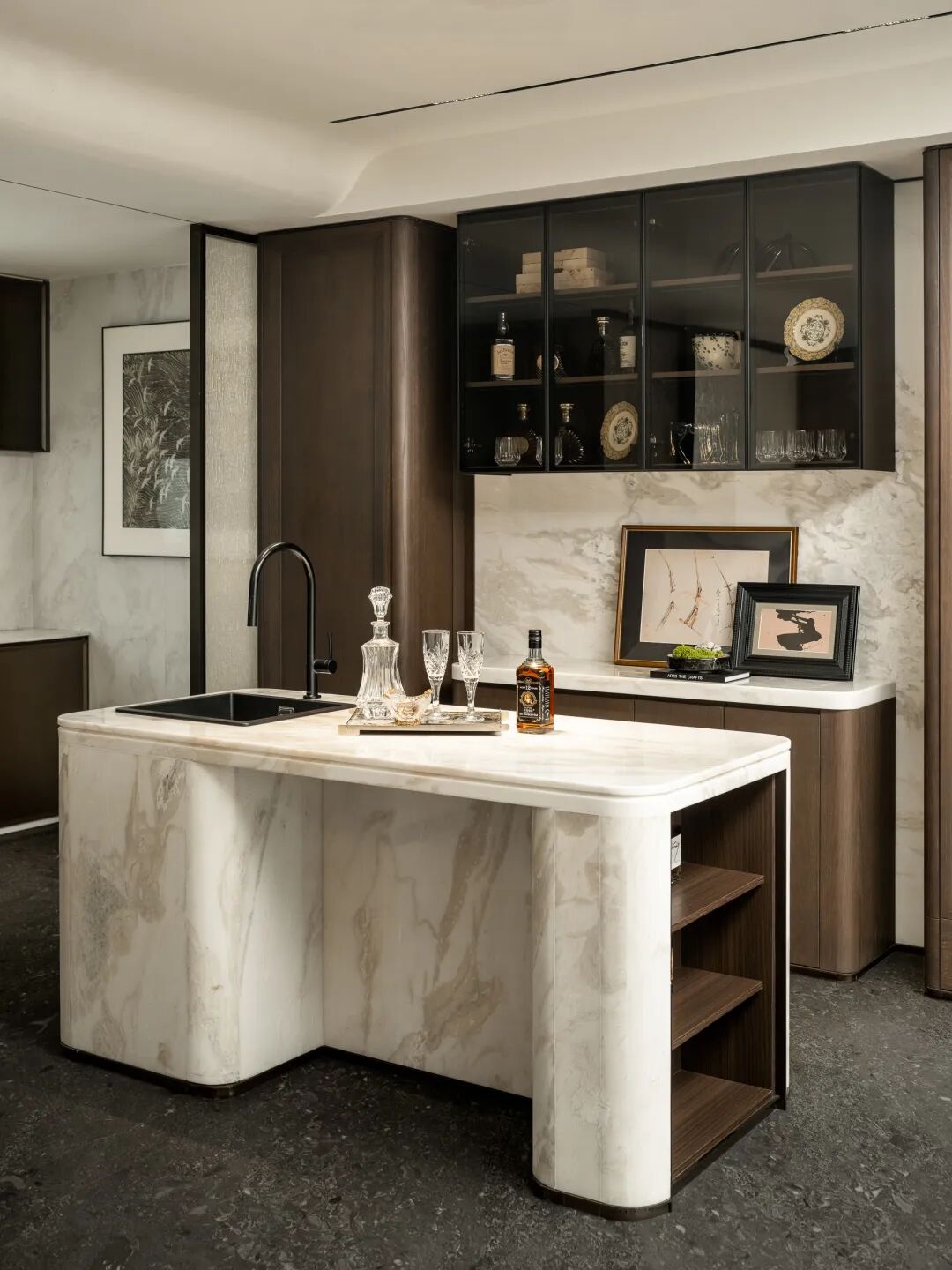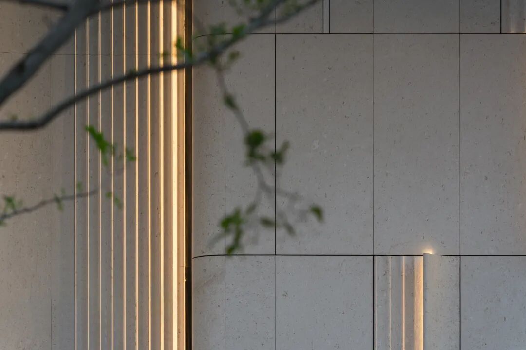 发光云石的奢华质感与建筑立面的石材、金属材质及曲线元素形成设计逻辑的统一,实现了传统石材元素与现代光影技术的跨界融合。