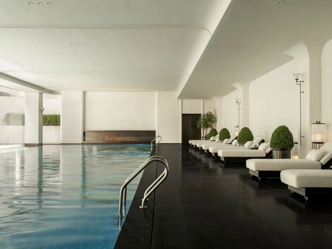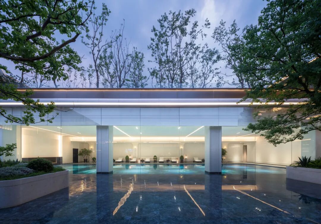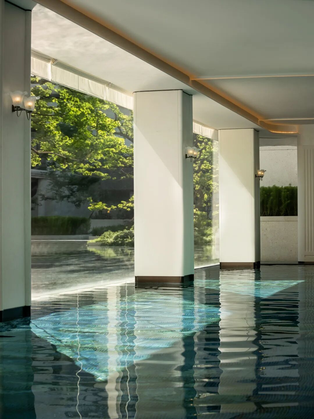室内泳池区域配备躺椅与景观视野,将游泳功能与休闲放松功能融合。