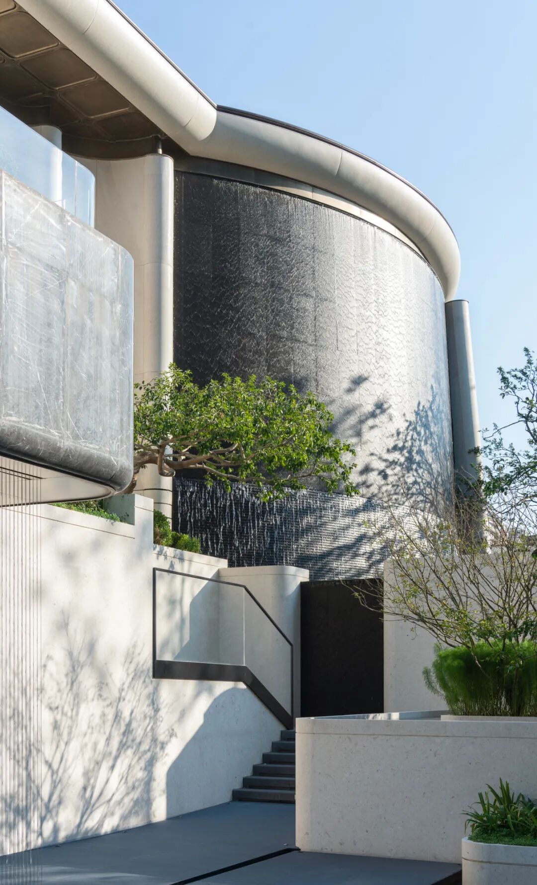 内侧立面采用连续曲线造型,屋顶与建筑体块以流畅的弧线衔接,形成极具雕塑感的立面形态,打破了传统建筑的直线刻板,赋予立面强烈的动态视觉张力,同时曲线的包容性也增强了空间的柔和感与艺术氛围。