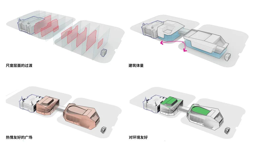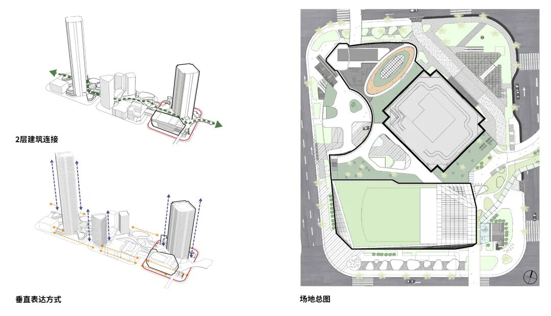 作为北外滩核心位置的新地标,本项目集办公、商业、剧院及文保建筑于一体,位于二层的“绿廊”将商务、商业与艺术的功能与周边地块有机串联起来,强化了社区的连通性与整体性。下沉广场直达地铁12号线,有助于有效组织人流,激活公共空间。
