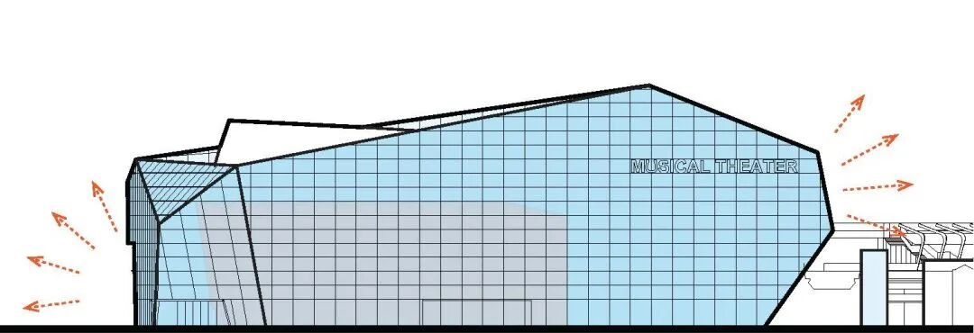 剧院建筑被构想为一个“类似于水晶体的发光音乐盒”,棱角分明的玻璃表皮有意仿效水晶体的切割面,与木质包覆的内部观众席空间形成鲜明对比。设计特别着重于昼夜形态的轮回转换。剧院建筑在白天呈现出现代简约的水晶体形态,夜幕降临后则会蜕变为璀璨夺目的珠宝盒。组合式灯光效果与不同透明度的玻璃材质交织在一起,并结合最新的LED技术与玻璃工艺,令剧院建筑得以焕发勃勃生机。