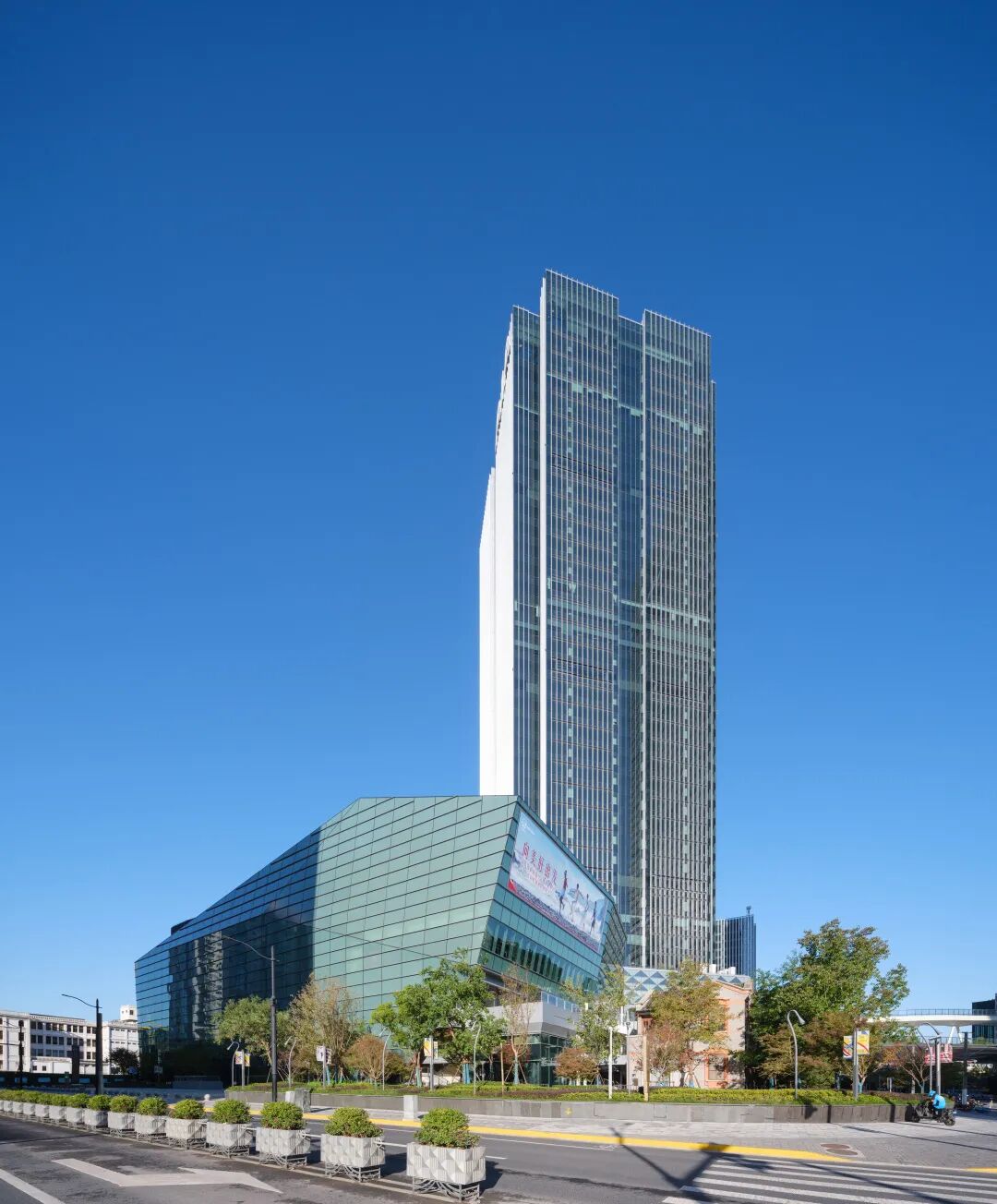 商业裙房的北立面采用金属面板和竖向纹理,结合玻璃幕墙和LED屏来吸引人流。东立面则采用通透的玻璃幕墙,结合剧院表皮营造文化氛围。