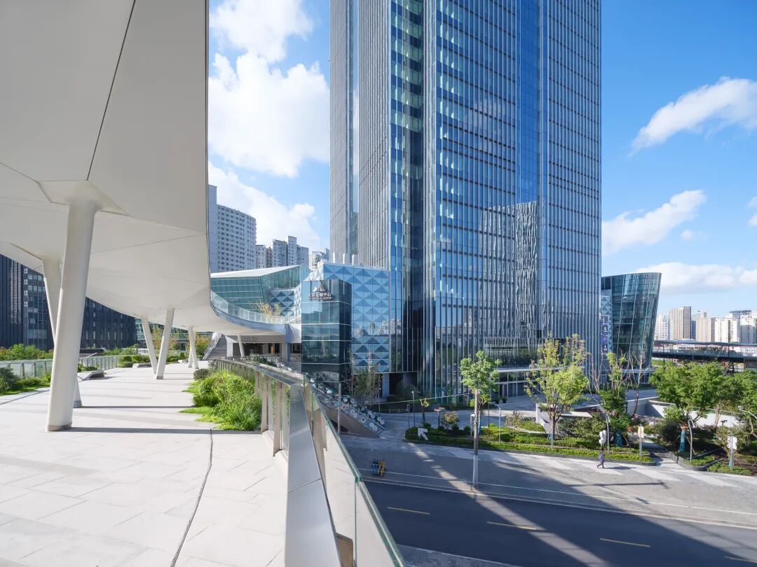 塔楼设计注重通过分割竖向体量、雕琢转角细部来打造简洁美观、挺拔向上的姿态。表皮采用全玻璃幕墙系统,结合竖向金属构件强调垂直方向上的挺拔感,并发挥遮阳作用。办公层的员工可通过一层大堂或二层连廊直接前往商业中心、剧院以及地铁站。