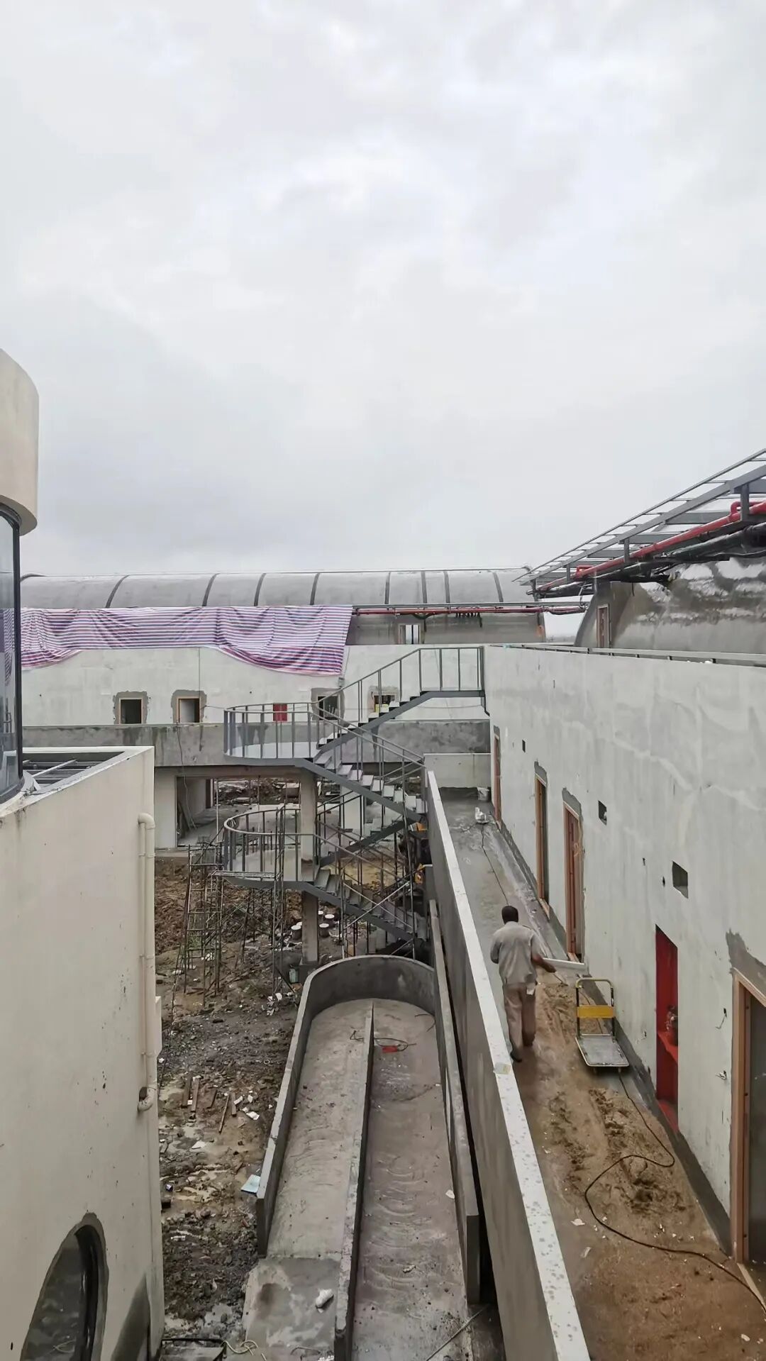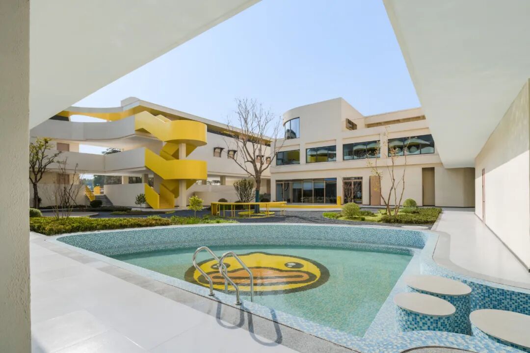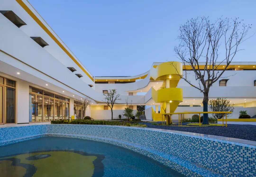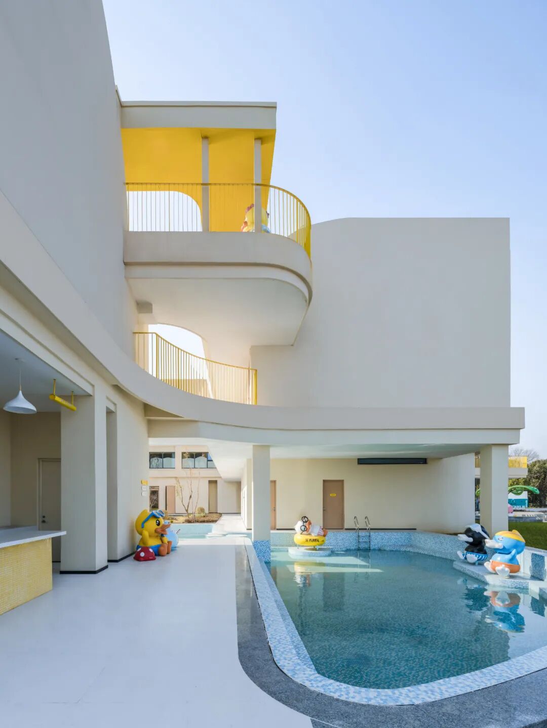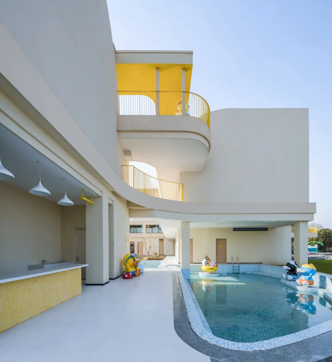 项目的标志性表达集中于西北侧的公共区域。餐厅上方的ETFE半透明膜结构构筑了一个弧形的灰空间露台,其轻盈的体量如同一顶巨大的庇护壳。从平台顶部延伸出的观景台,其上方镶嵌着抽象的小黄鸭圆形Logo,使之成为整个聚落的视觉焦点。与之呼应的是东北角的圆形泳池,它以鲜明的几何形态进一步强化了IP的场所感。