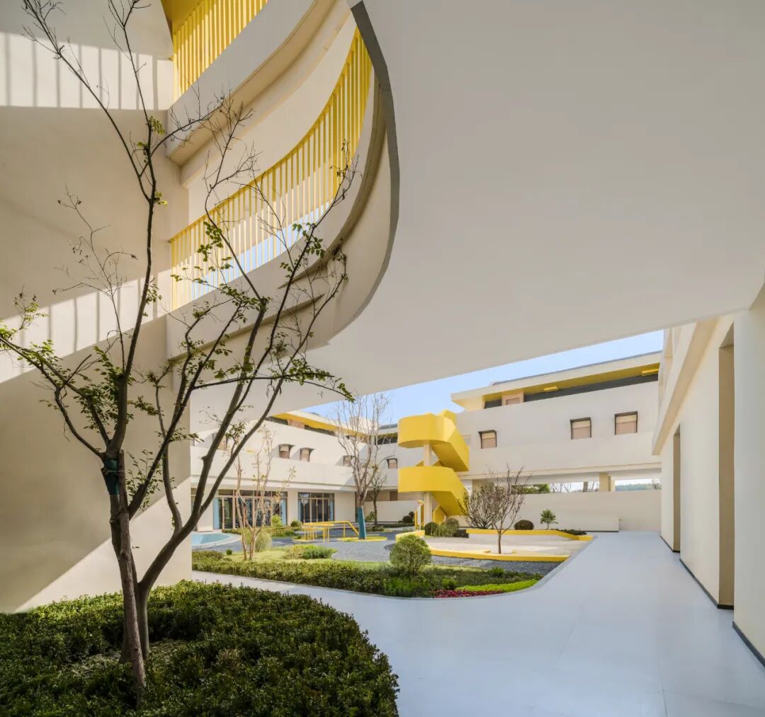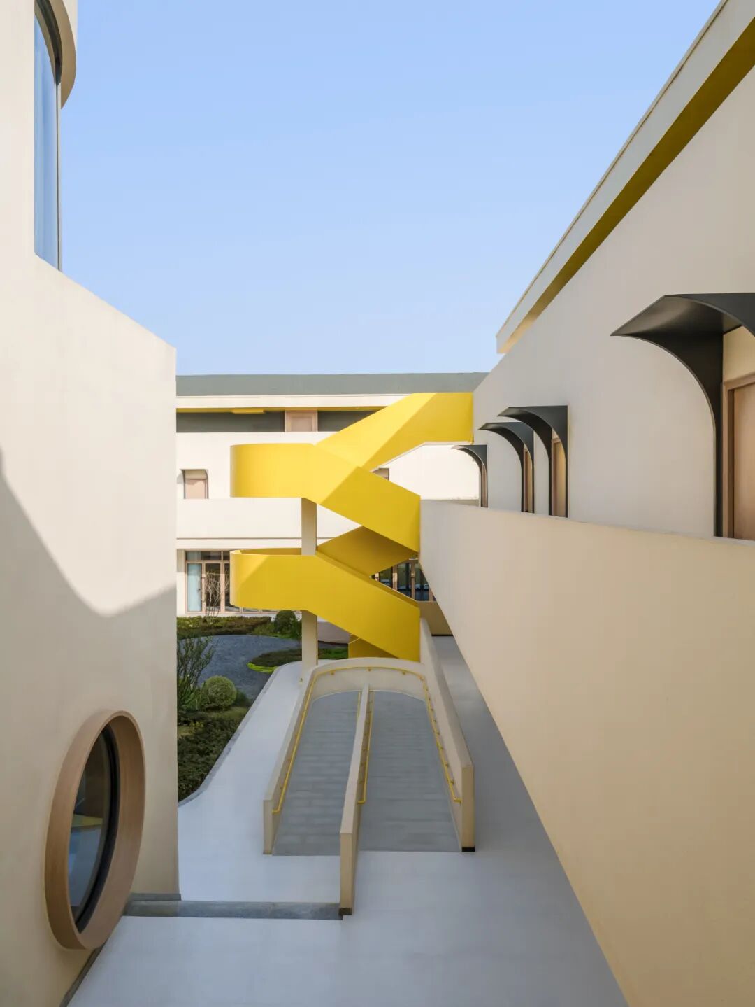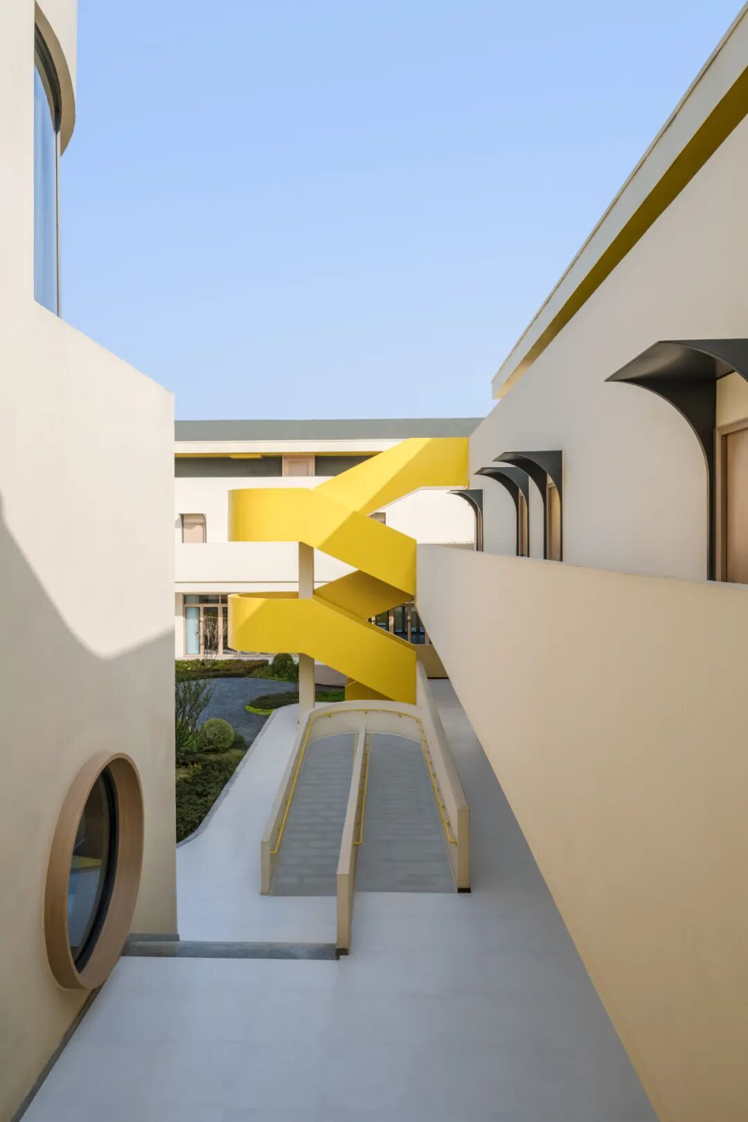 我们创造了大量趣味的互动场所,旨在激活儿童的运动细胞。连接各客房体量的三层环形外廊构成立体观景系统,鼓励孩子在不同高度发现不同视野。东侧和南侧三楼客房内从夹层盘旋而下的室内滑梯,则将日常起居变为充满笑声的微型冒险。这些设计不仅提供了自由玩乐的机会,更在无形中增强了孩子的体质。