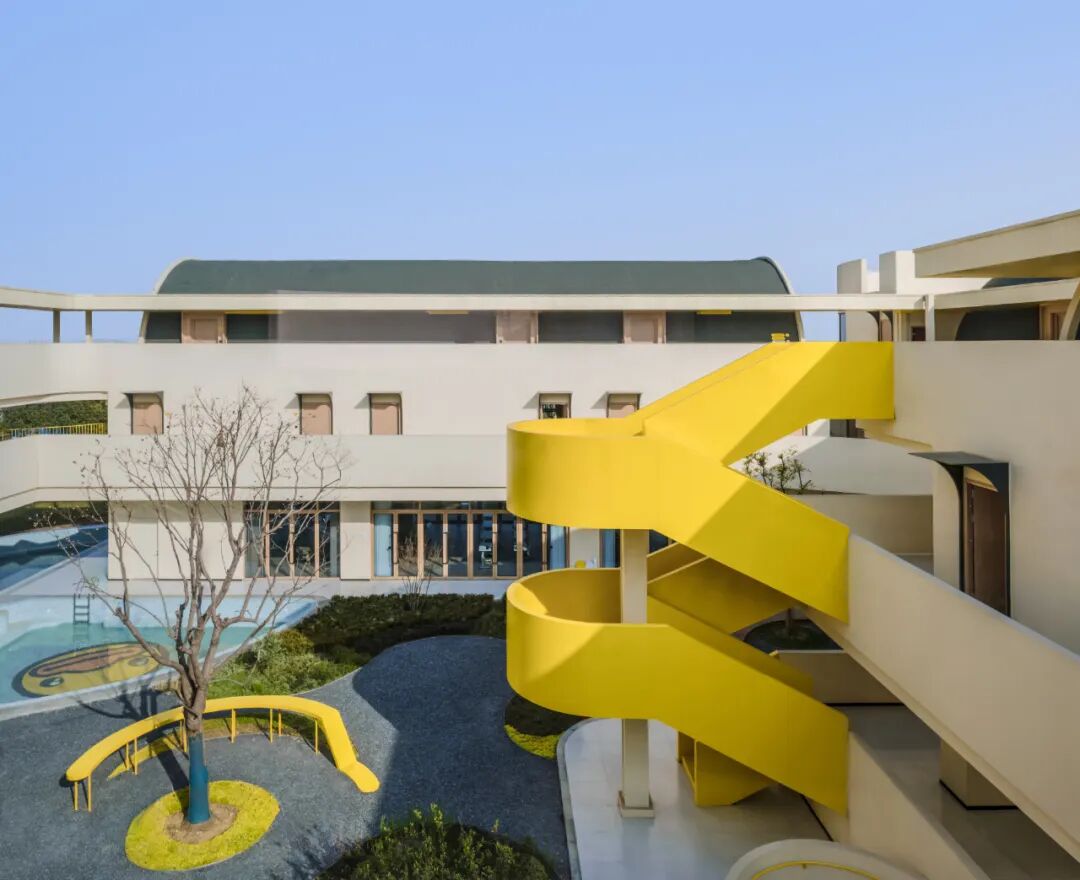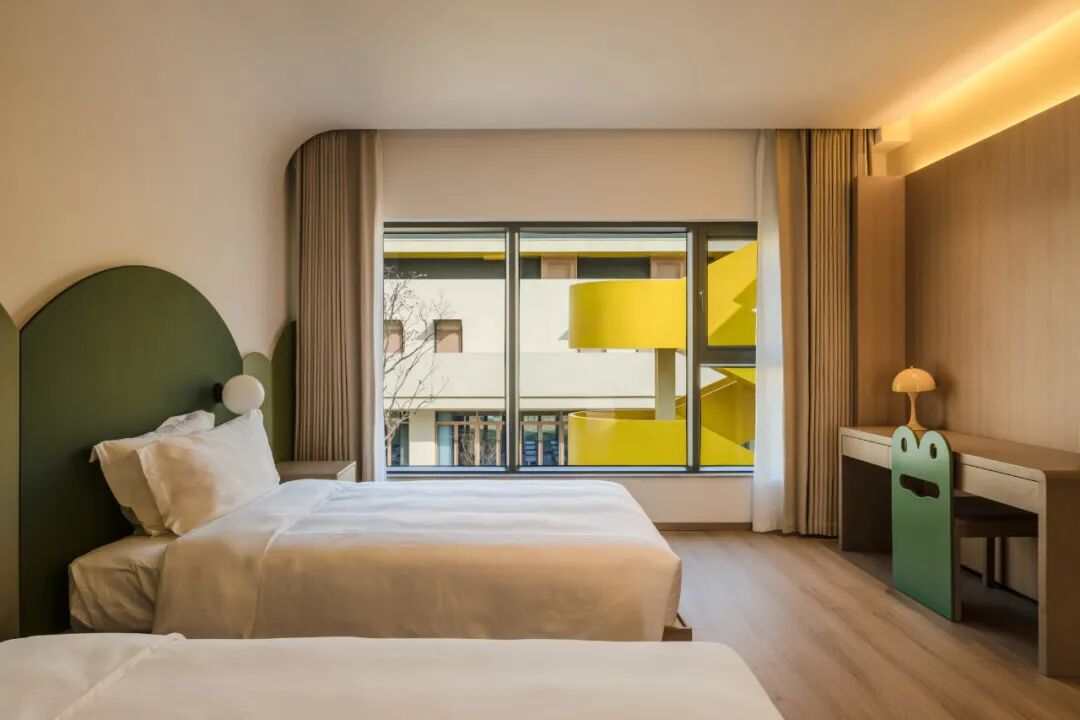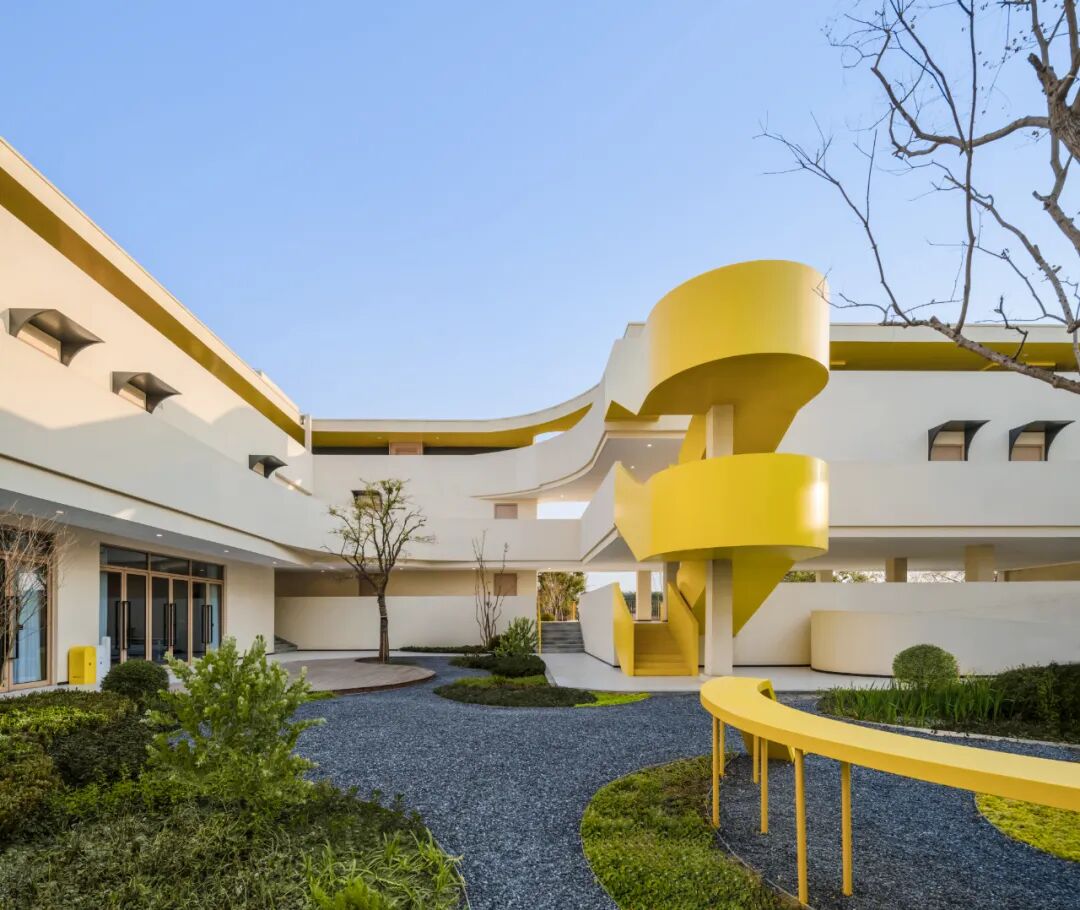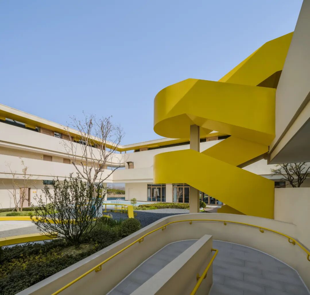 最终,IP的体验落脚于沉浸式的场景营造。部分位于景观最佳方位的客房,充分利用弧形坡屋顶结构,创新性地设计了内含夹层的Loft户型。一个专属的室内滑梯从夹层盘旋而下,将居住空间变为一个微型的冒险乐园,完美构成了“下层共享,上层探险”的趣味家庭单元。而散落在庭院、廊角等各个角落里的小黄鸭主题雕塑,则如同寻宝游戏中的彩蛋,不断丰富着空间的叙事层次。