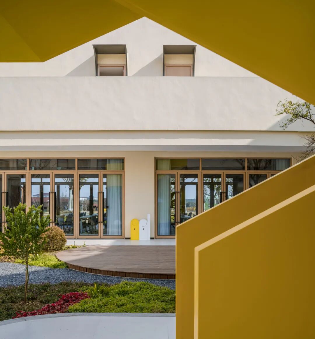 通过建筑南侧底层的局部架空和东侧厅房的完全开放,重构了空间与自然的联系,让家庭宾客在安全的环境中共同探索自然。在灵动趣味、活泼清新的自然新氧中,享受沉浸体验,沉浸在享趣氛围与趣味环绕之中。