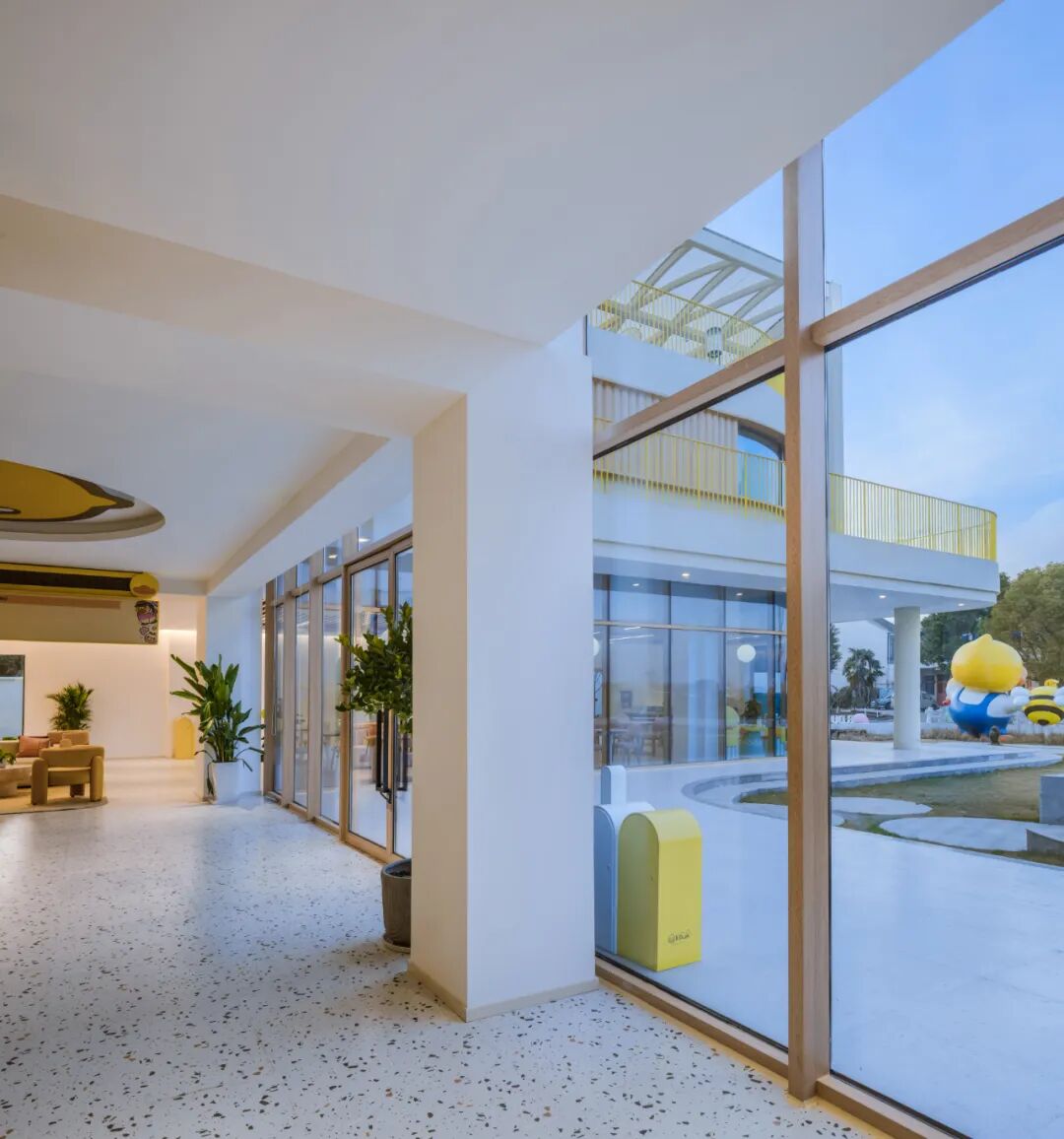 IP叙事始于形态的契合。建筑整体采用的弧形坡屋顶,其柔和轮廓不仅与周边乡村风貌形成对话,更在宏观尺度上呼应了小黄鸭可爱的造型基因。这一曲线语言被延伸至廊道平面的弧形倒角及墙体的圆角处理,在人的行进与触碰中,持续传递圆润、安全与友好的氛围。