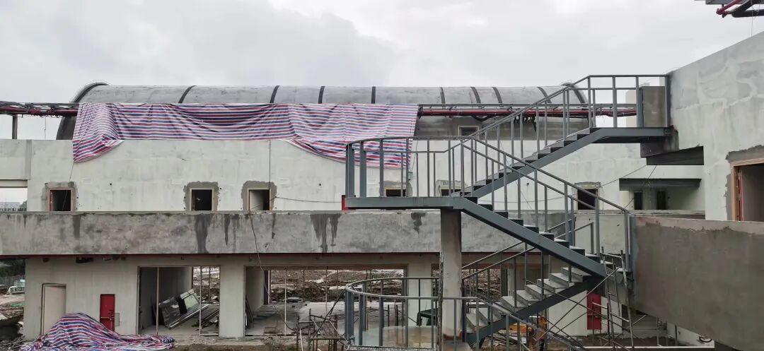 主要材料:肌理涂料、超白中空玻璃、黄色彩钢栏杆、ETFE膜、油毡瓦