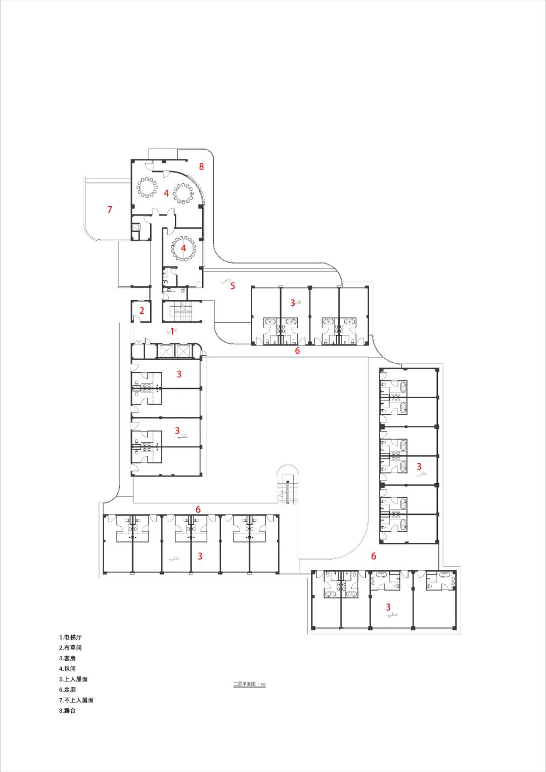 为实现“景观最大化”的承诺,我们构建了一个立体、流动的景观游历体系。连接四个主要体量的三层环形外廊是此体系的核心。它超越了交通功能,成为一个立体的“观景器”。宾客漫步于不同高度的廊道中,视野在私密庭院、保留树冠与远方湖光之间交替变幻,步移景异的体验让每一次穿梭都充满发现的乐趣。
