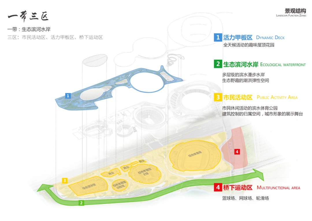 德胜体育中心的景观设计以“人与自然和谐共生”为核心理念,巧妙构建了“一带三区”的多元景观结构,旨在打造一个超越赛事本身、服务于城市与市民的综合性公共空间。