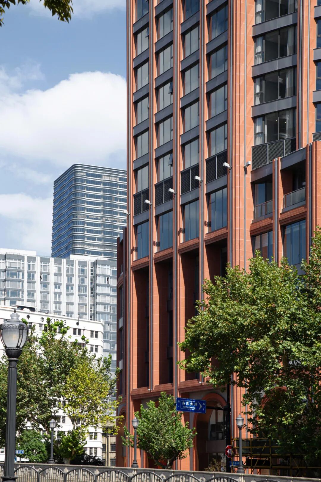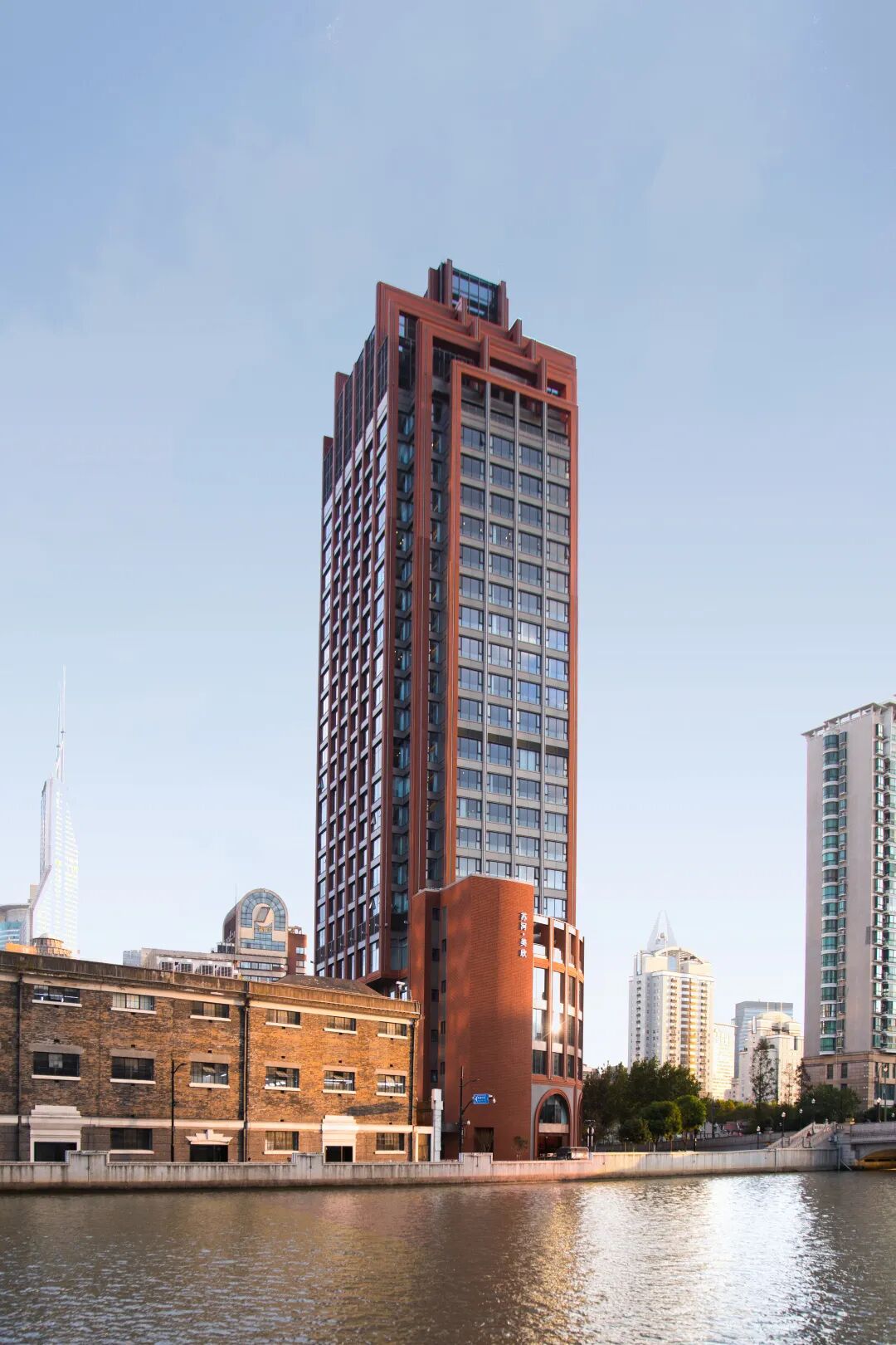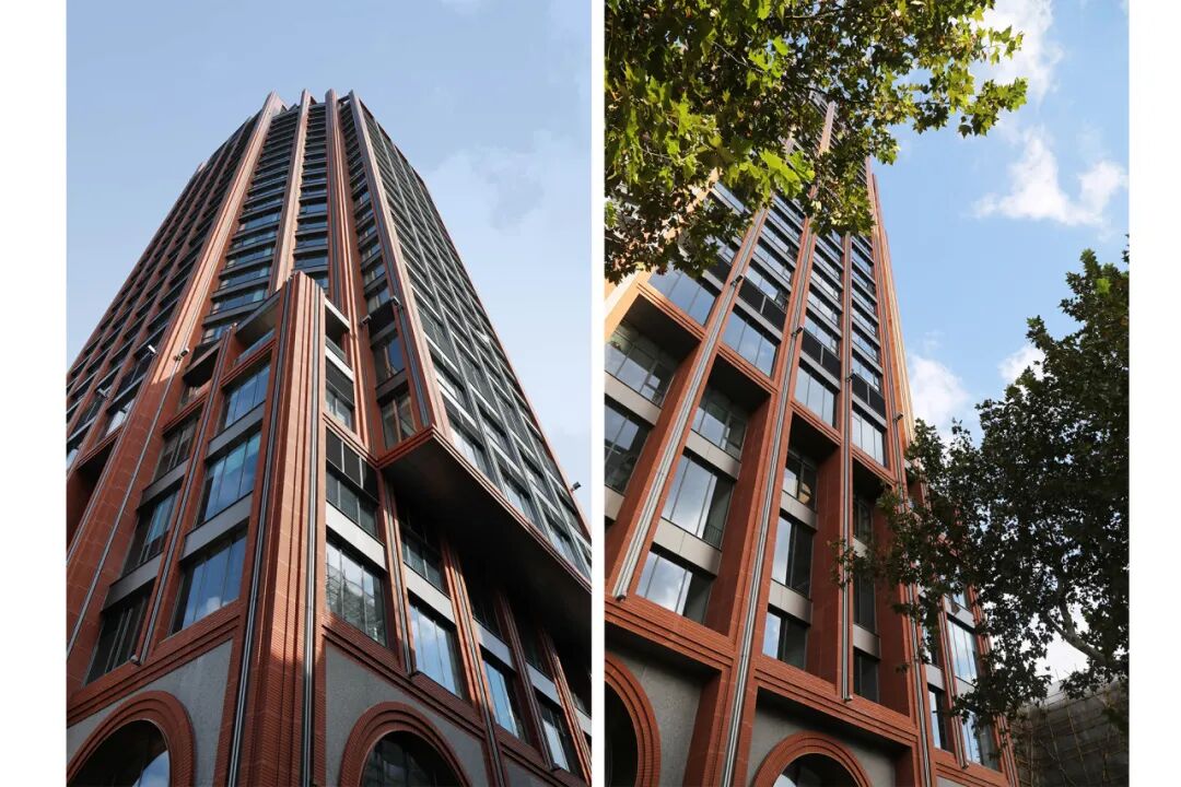 · 设计策略:延续苏州河沿岸历史建筑群的竖向立面线条节奏,并融入红砖、圆拱等体现外滩近代建筑特征的经典元素,通过层层递进的装饰线条重新勾勒出建筑挺拔而优雅的轮廓。这既是对海派文脉的致敬,也是对“煤气包”工业记忆的一种抽象化、艺术化的当代转译,让历史在新的功能体中得以延续和升华。