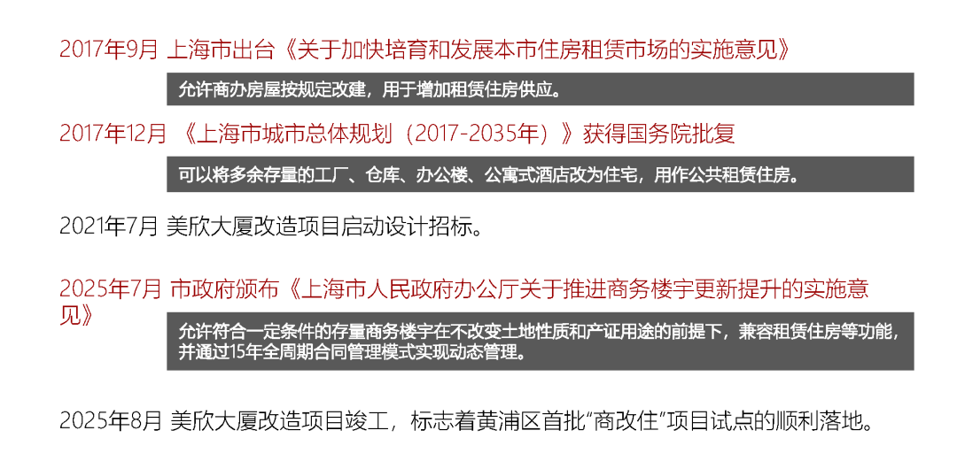 · 关键突破:2025年《关于推进商务楼宇更新提升的实施意见》的发布,允许存量低效商务楼宇在“三个不变”(主体、产证、结构)前提下兼容居住功能,为美欣大厦的转型提供了精准的政策依据和操作指南。