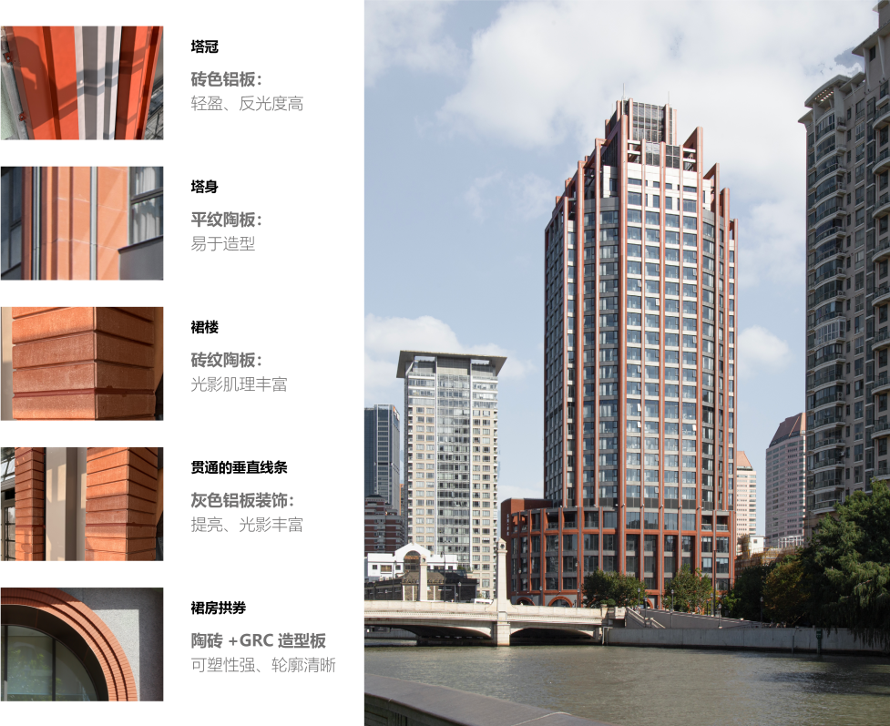 · 设计语言:从苏州河水岸近代历史建筑中汲取灵感,运用具有上海近代建筑特征的的装饰主义手法(ART DECO),对建筑立面进行重塑。