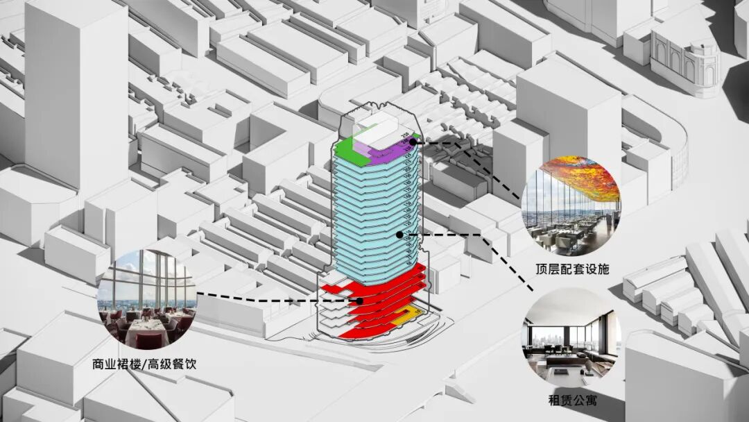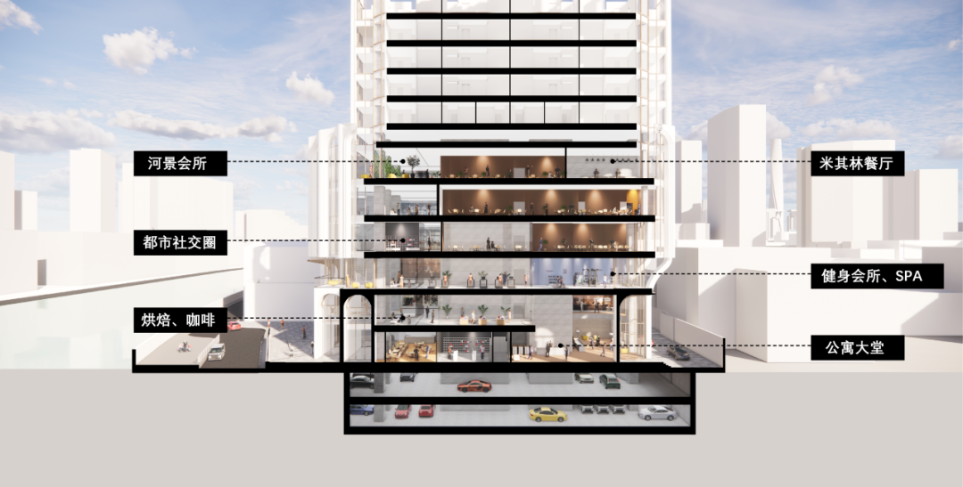 · 垂直社区的理念:以城市更新为背景,写字楼在向居住功能转化的同时将兼顾未来居住人群完整生活链的配套。苏河美欣在概念策划阶段就提出了“滨水垂直社区”的理念,将裙楼与楼顶作为与公寓相匹配的商业功能,补充历史街区中所缺少的社交型、便利型生活设施,塑造面向未来的生活方式。