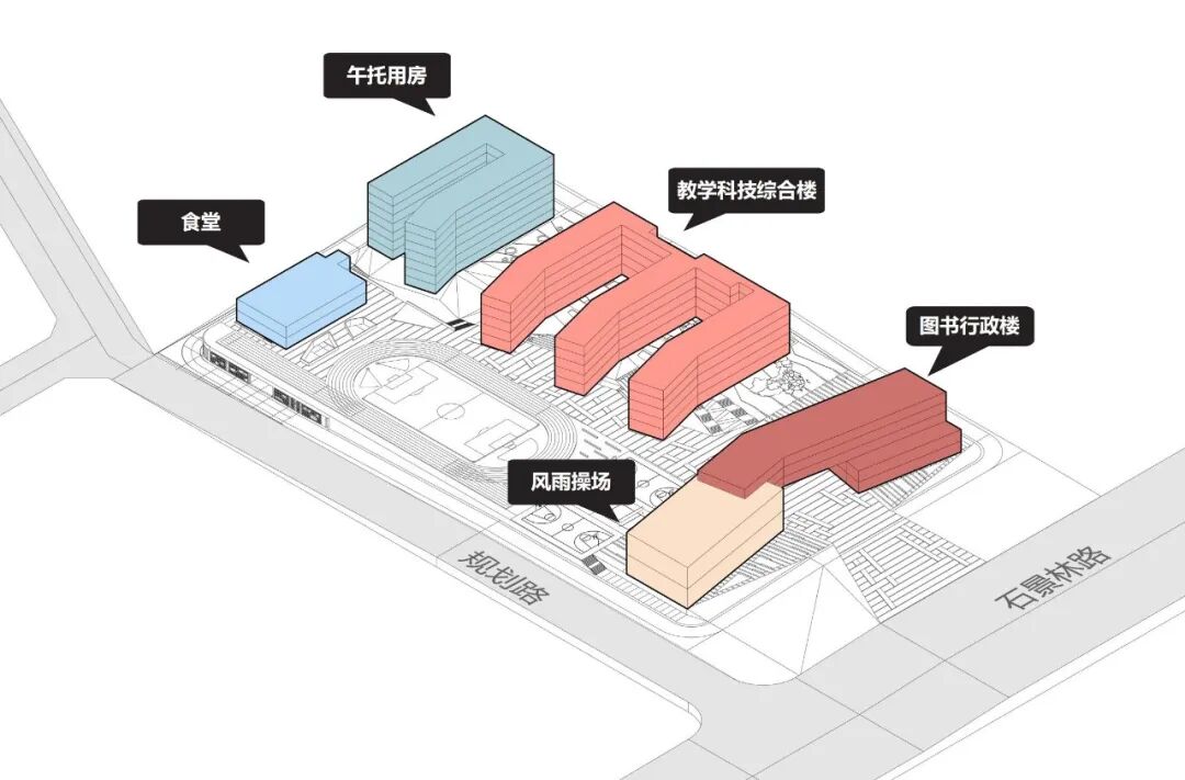 多措并举解决小学接送停车难题:校园南部主入口设置早晨送达的停车缓冲岛;借助城市绿化带构建生态绿化停车场;在西北侧利用下沉地形在运动场下方设置架空停车场,下沉庭院为学生提供舒适等候、便捷通达、安全离校的多元空间。