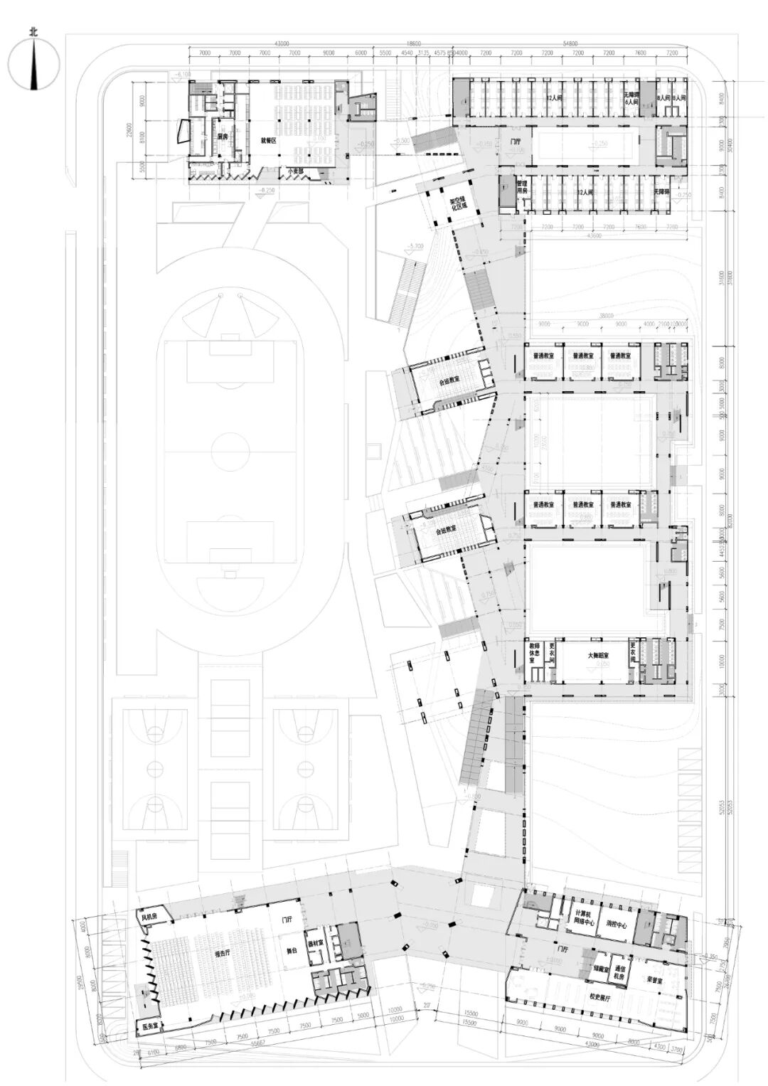 多院——建筑和建筑间、建筑和室外体育场间形成互相渗透的多样化院落。互融的庭院、底层的绿台、草坡等多种的景观配置共同营造出一个立体化、生态化、多样化的活力校园。