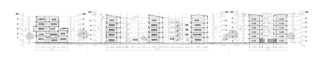 四线——教学行政区、生活后勤区、体育运动区间形成东西向的空间次轴线,为学生提供休闲、生态、舒适的休憩空间。
