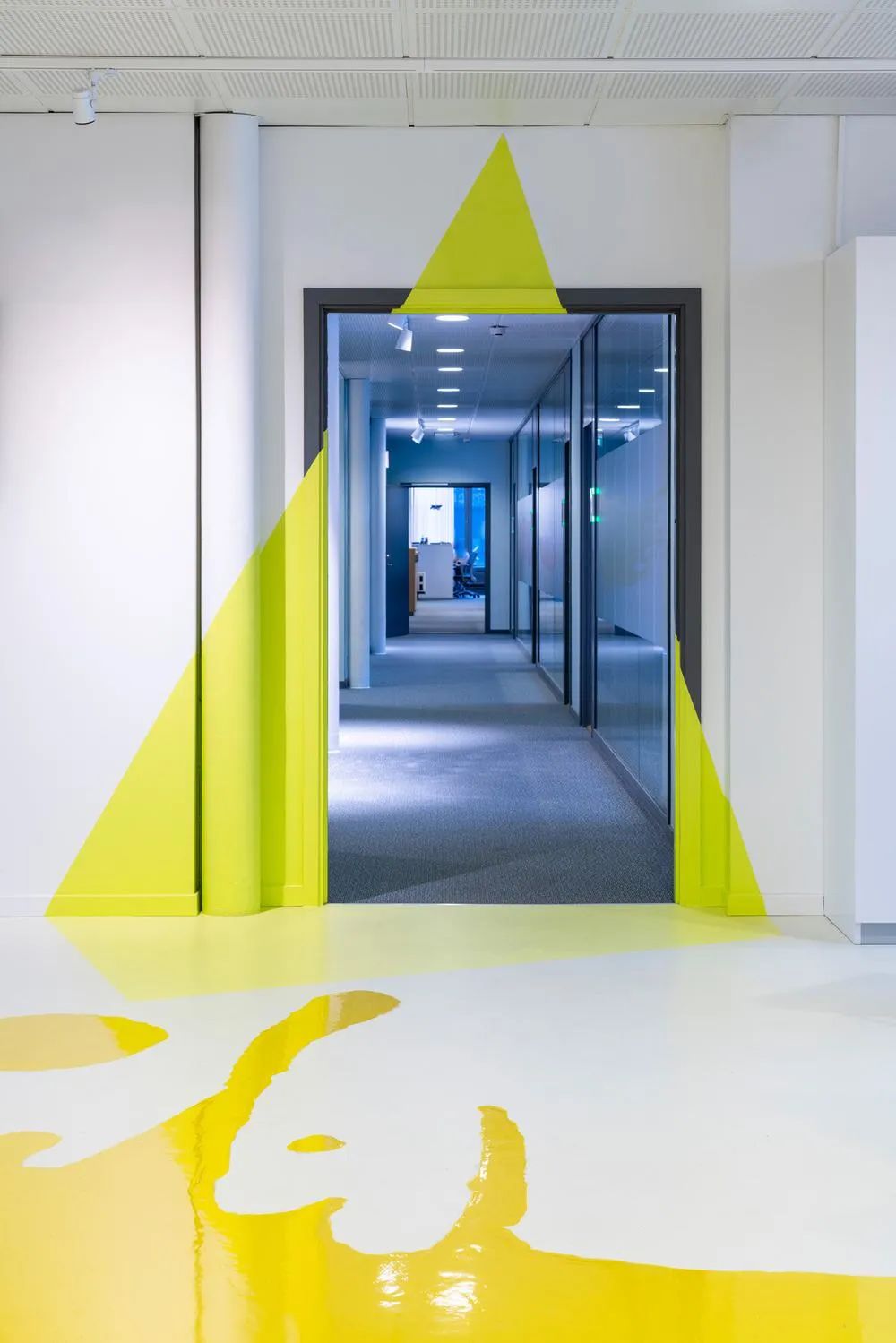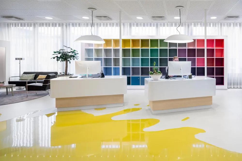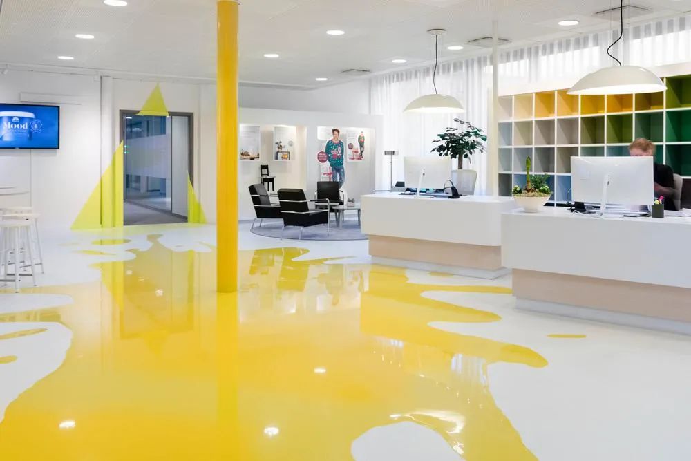 “在任何时候,我们都想激励人们过上多彩的日常生活。” Tikkurila的使命也成为他们新的工作场所的设计灵感。从进入大厅的那刻起,自由流淌在地面上的油漆质感就以其独特的表达方式呈现出公司的属性。