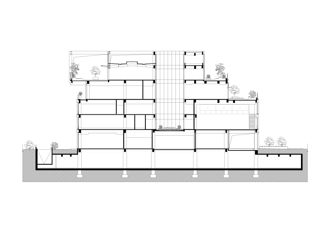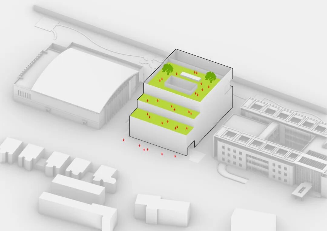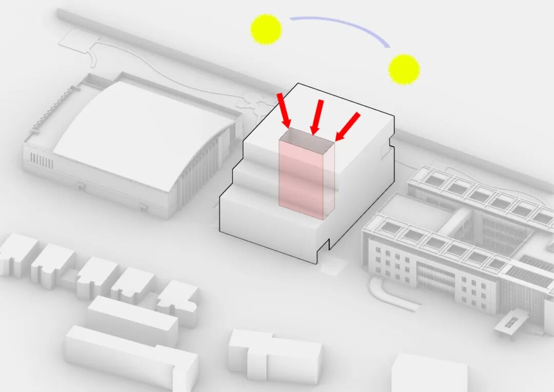 新建建筑以谦逊姿态融入街区肌理,通过切削空间实现新旧对话:北侧沿街界面采用三层退台式切削处理,将建筑高度控制在15米以内,与两侧老建筑形成统一的高度关系。自四层起向南侧采用阶梯式抬升手法,塑造出“层峦叠翠”的渐进形态。这一设计既消解北侧体量对街道的压迫感,又为行人营造出开阔的视觉体验,更通过错落有致的轮廓线,为城市增添富有韵律的天际线轮廓。