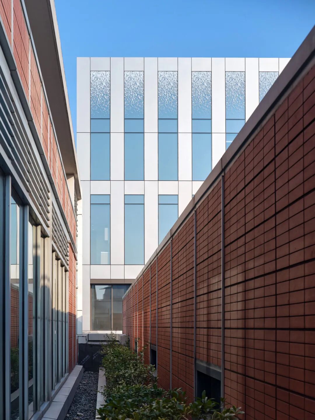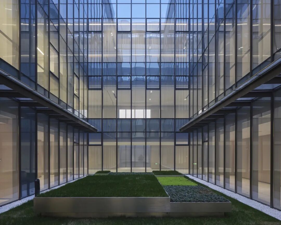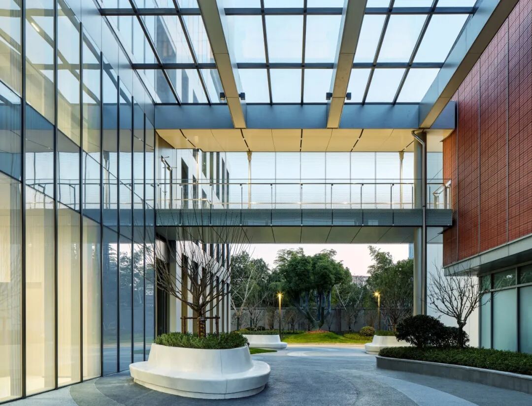 形成极具现代艺术感的绿色肌理。从各楼层俯瞰,宛如一幅精心编织的绿色地毯;仰望时,又融入江南传统庭院“四水归堂”的空间意境,实现现代与传统的美学对话。