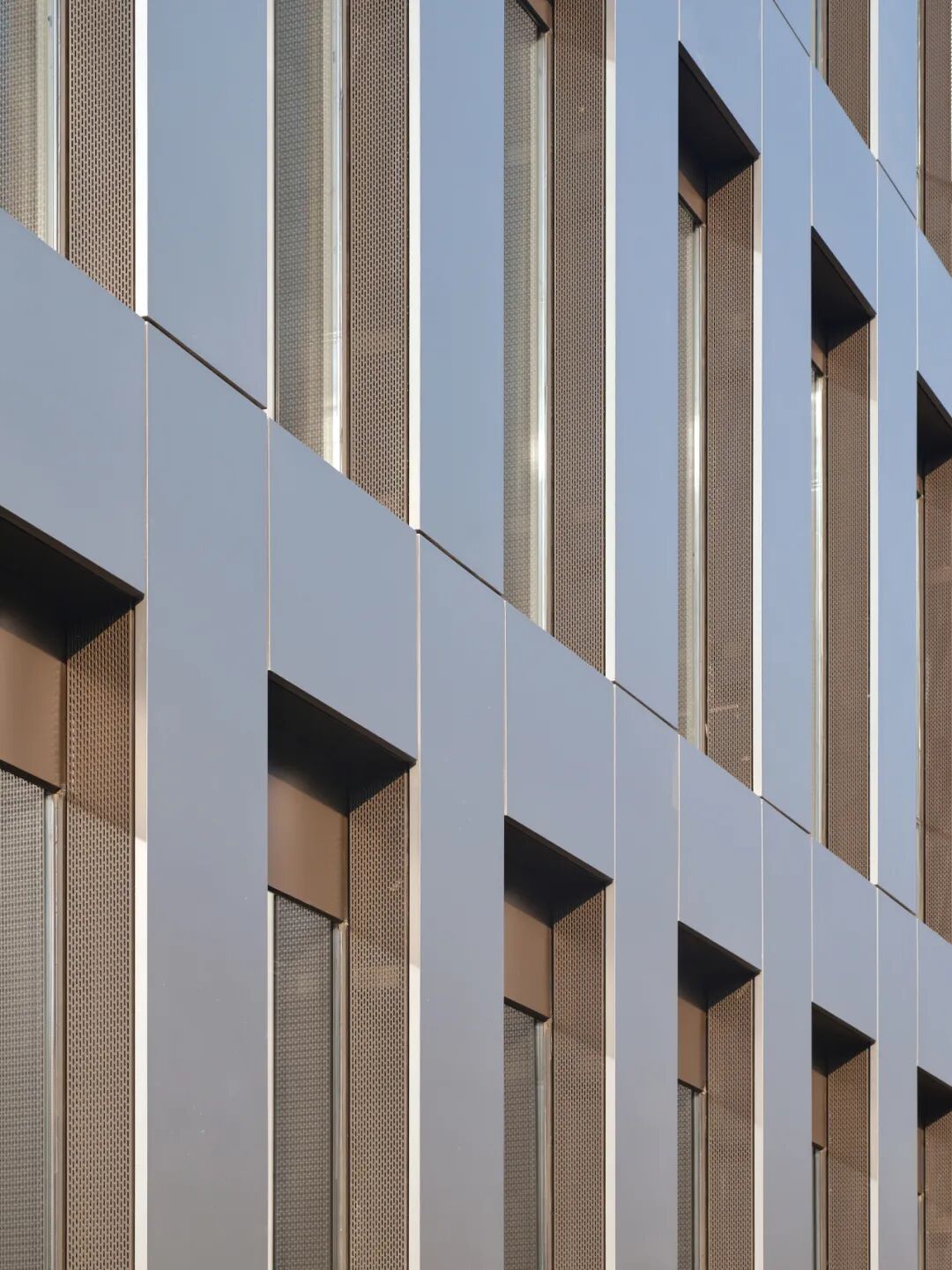 为确保立面的整洁纯粹,建筑幕墙把自然通风、屋面排水进行一体化设计。室内开窗式通风器与外立面凹窗套两侧的深色穿孔铝板结合,避免主立面窗户开启的凌乱感,同时还为建筑立面增加立面细节;屋顶露台的雨水排水管道隐藏于幕墙铝板空腔中,巧妙地解决排水管外露问题。