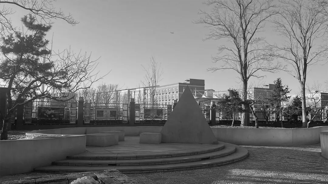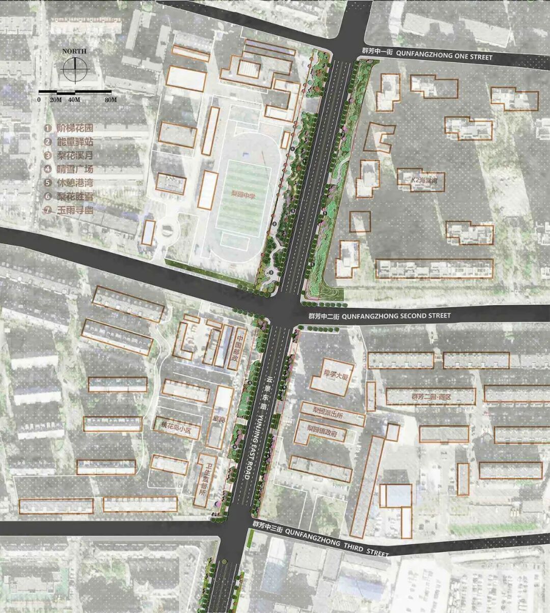 打造“阶梯花园+能量驿站+梨花溪月”三位一体场景。160m长的阶梯式绿地解决场地高差,同时提供休憩坐凳,“能量驿站、梨花溪月”成为学生等候、老人闲谈的核心节点。