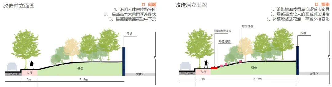 以“开放共享”为核心,通过“拓宽步道 + 增设停留点”,将道路附属空间转化为居民可参与的生活空间,形成“一段一特色”的功能分区。