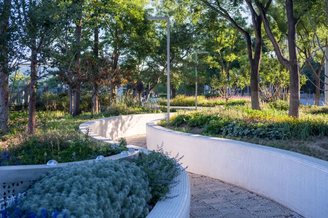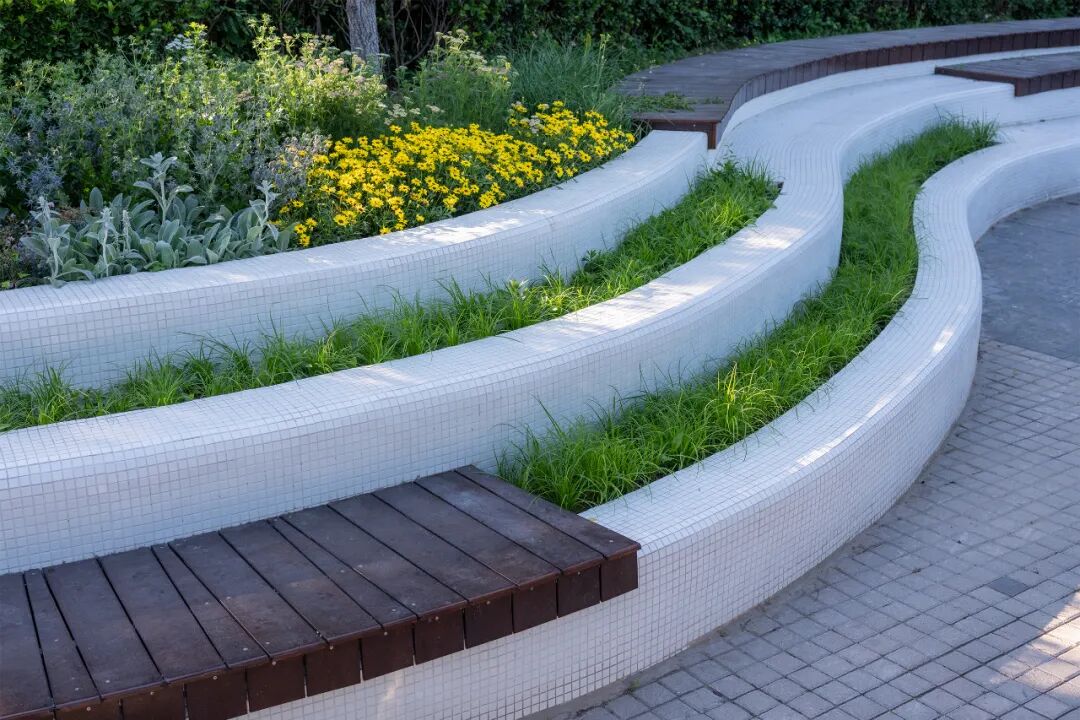 用”微地形 + 挡墙绿化”技术消化2.5m场地高差,挡墙内侧嵌入坐凳,兼具固土与休憩功能,景石配置地被草花,形成“隐于绿中”的邻里交往空间。