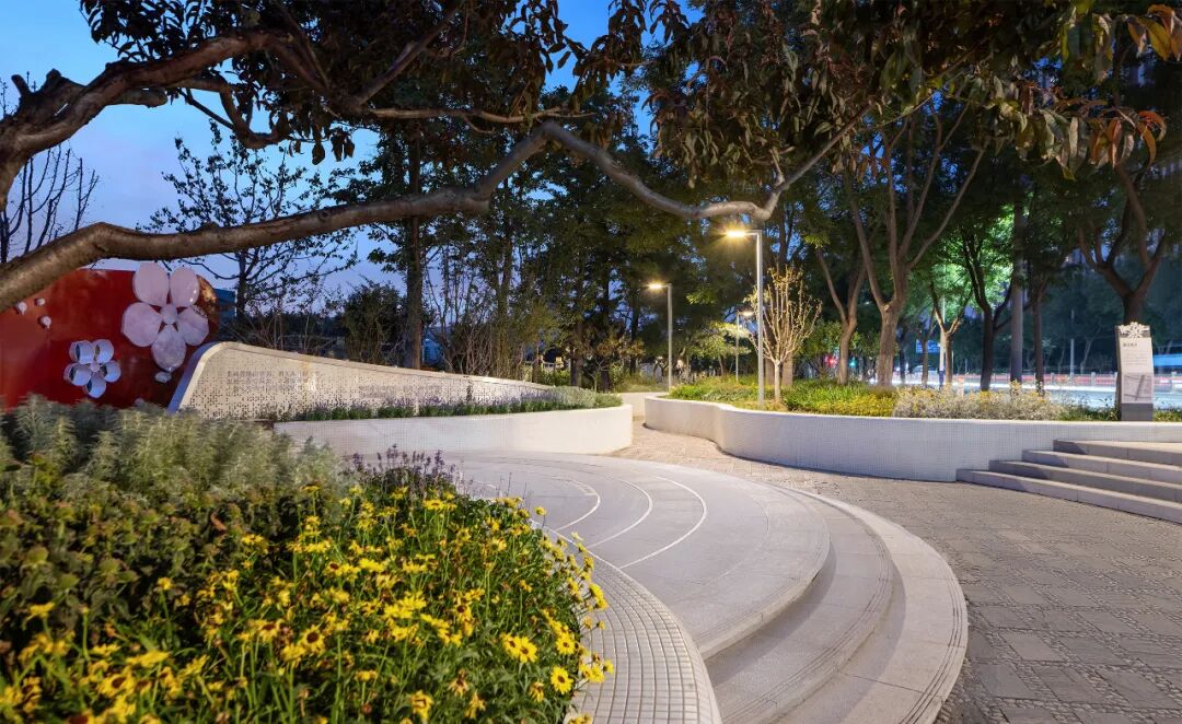梨花主题特色景墙结合坐凳为人群提供交流与共享的空间,配置春花植物,绿视率从 30% 提升至 75%,既保持政务空间的庄重性,又增强与市民的互动性。