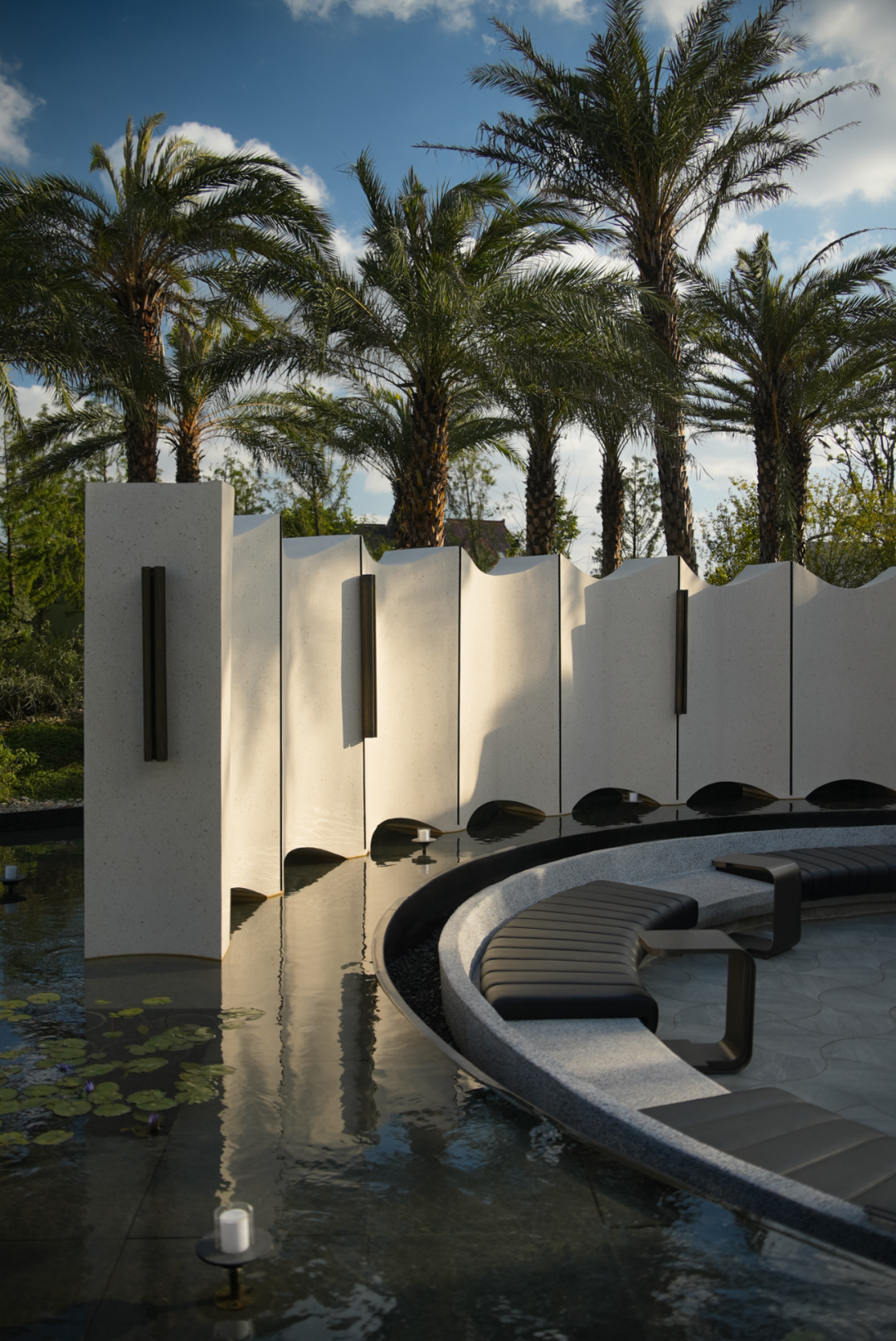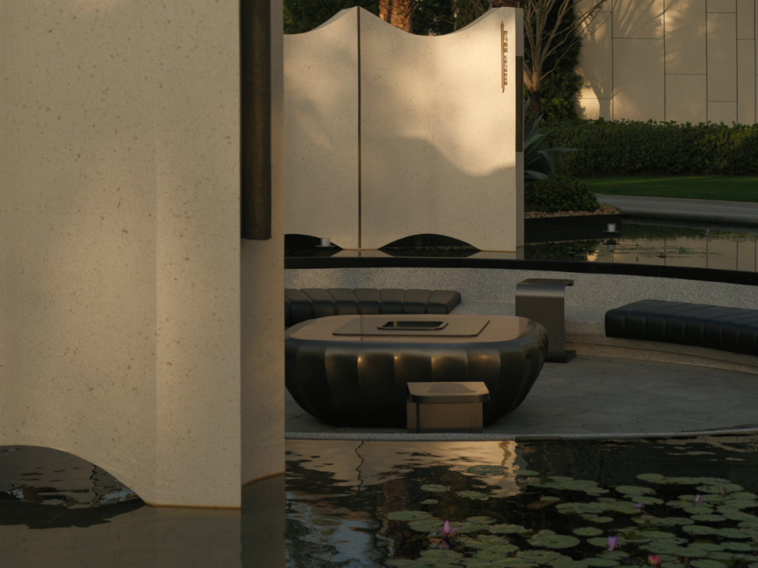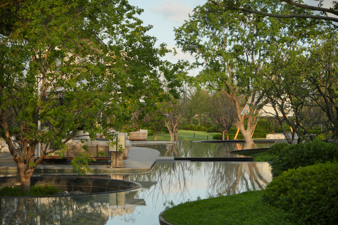 从平静如镜的冥想水面到微波荡漾的社交水院,水的不同形态对应着不同的情感需求。