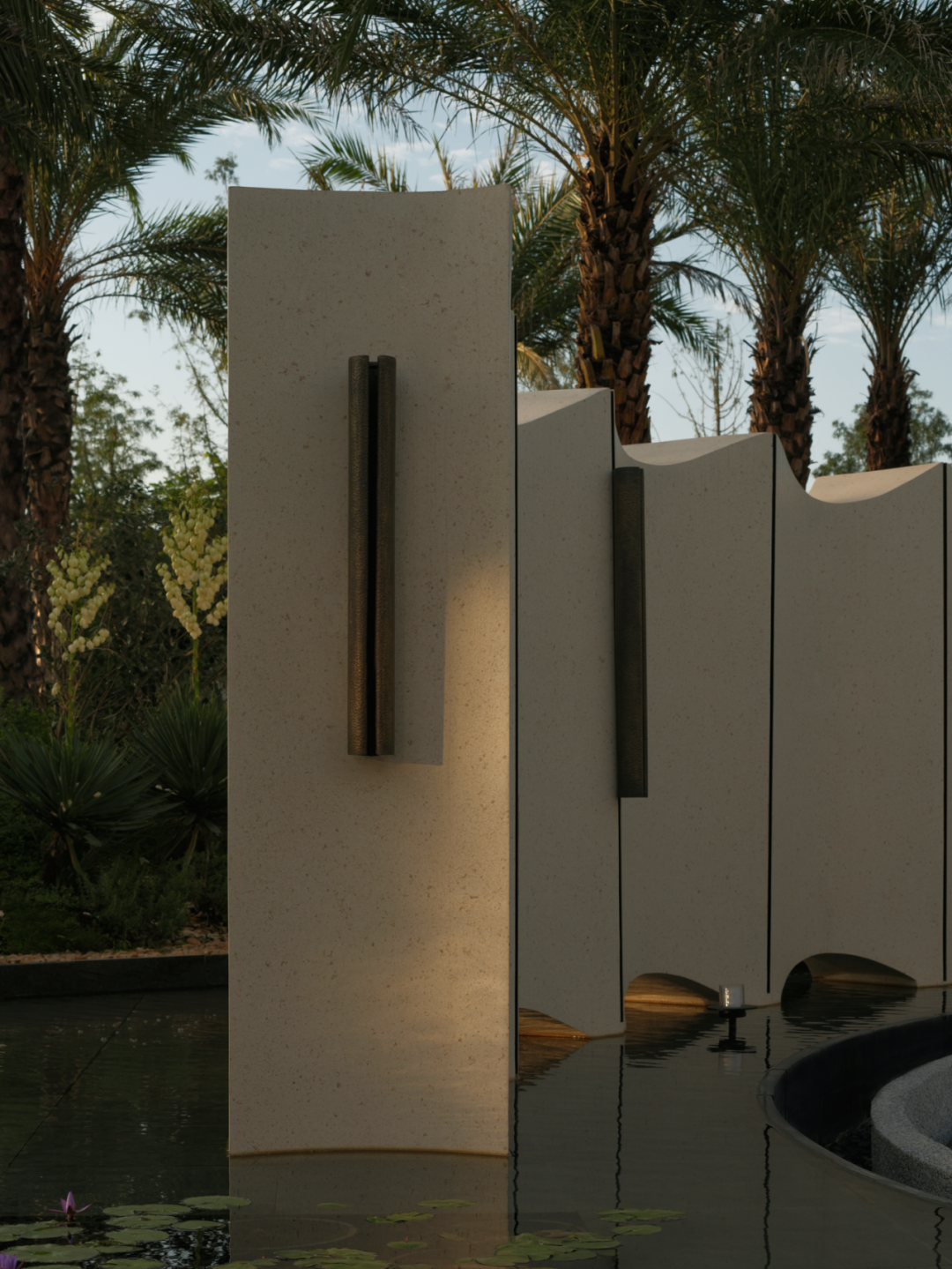 银海枣指引着纵向的视觉轨迹,睡莲锚定水平面的视觉焦点,鼠尾草和薰衣草在嗅觉维度编织地中海的记忆迷雾。