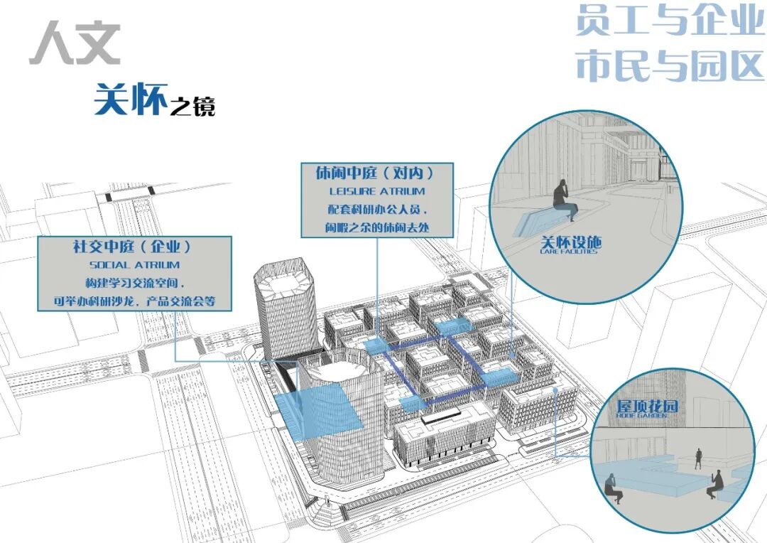 园区界面与城市环境深度对话,消隐内外边界,形成与城市共融的视觉通廊与街角地标。在这里,企业文化不再是抽象的符号,而是融入景观的叙事语言;人文关怀与复合功能交织于每一处空间细节,使高新技术产业在绿色、包容、充满活力的场景中自然生长。