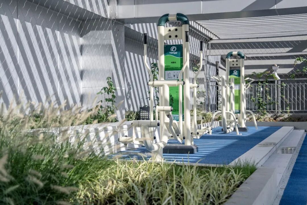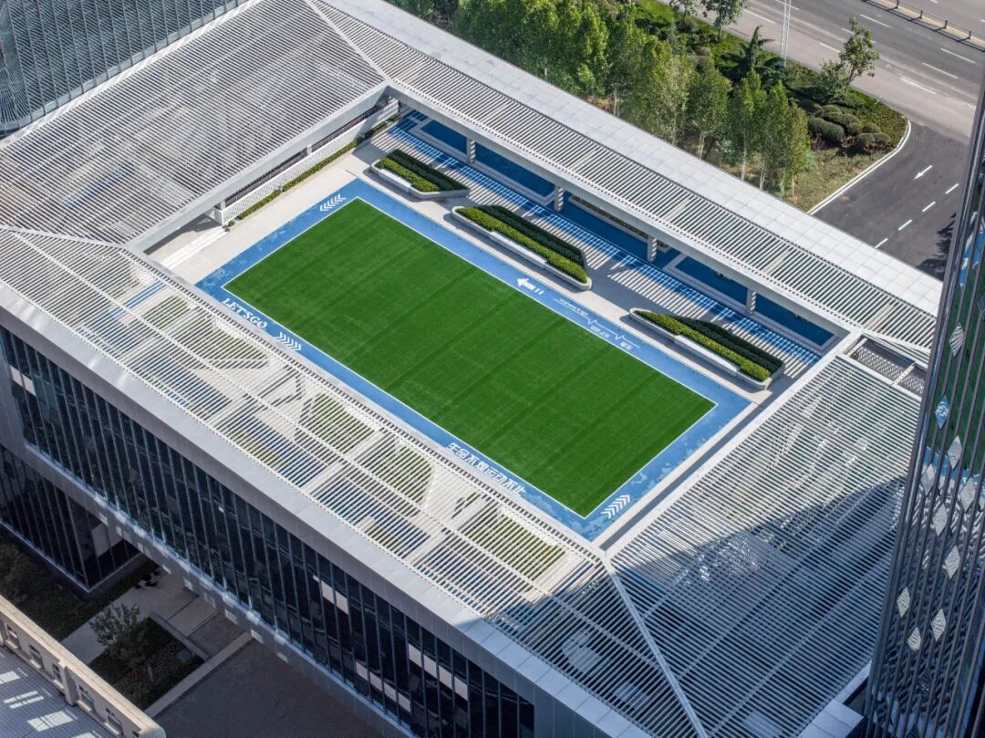 屋顶中央阳光草坪作为核心空间,兼具灵活性与实用性。它不仅为日常健身、瑜伽等运动提供柔软舒适的场地,还可转化为举办团体活动、庆典聚会与户外餐饮的多功能场所。从两侧塔楼俯瞰,开阔的绿色视野,极大提升了建筑内部的视觉体验与环境品质。