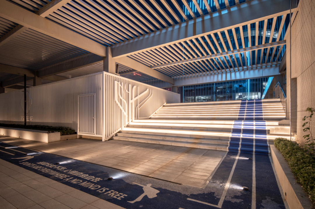园区东侧紧邻城市干道港西路,是园区面向城市的重要展示界面,其东北角作为此界面的焦点,将其塑造为凝聚园区精神、彰显品牌形象的视觉地标。设计意图在于将消极空间转化为积极空间,利用地形高差进行价值转化及赋能,并融入立体绿化系统,形成街角的对景空间。