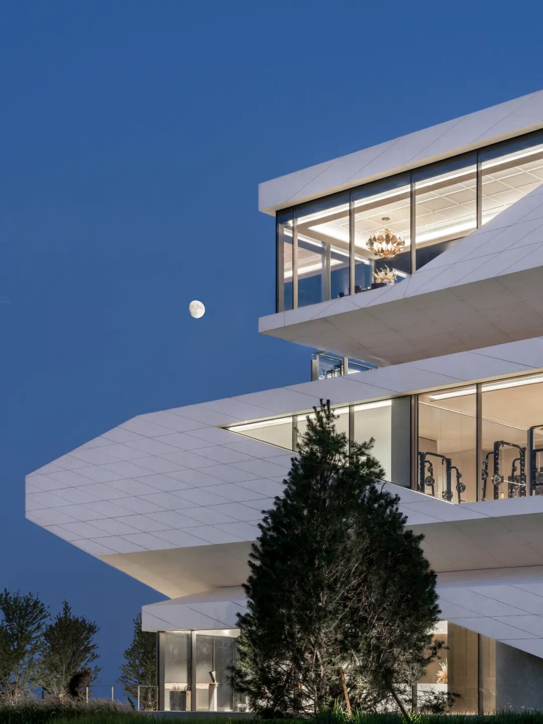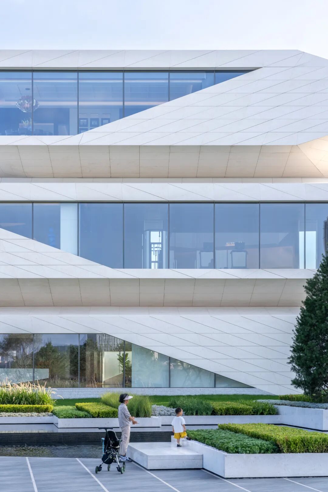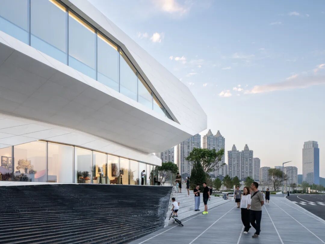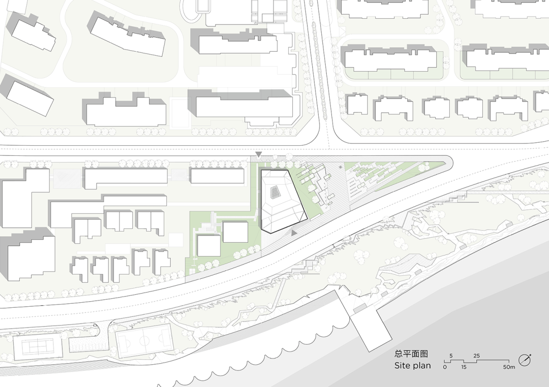 隐蔽:首层空间作为整座建筑的“基石”,与滨海步道衔接。半虚半实的体量,融入绿地景观中,呈现低调隐匿的姿态。